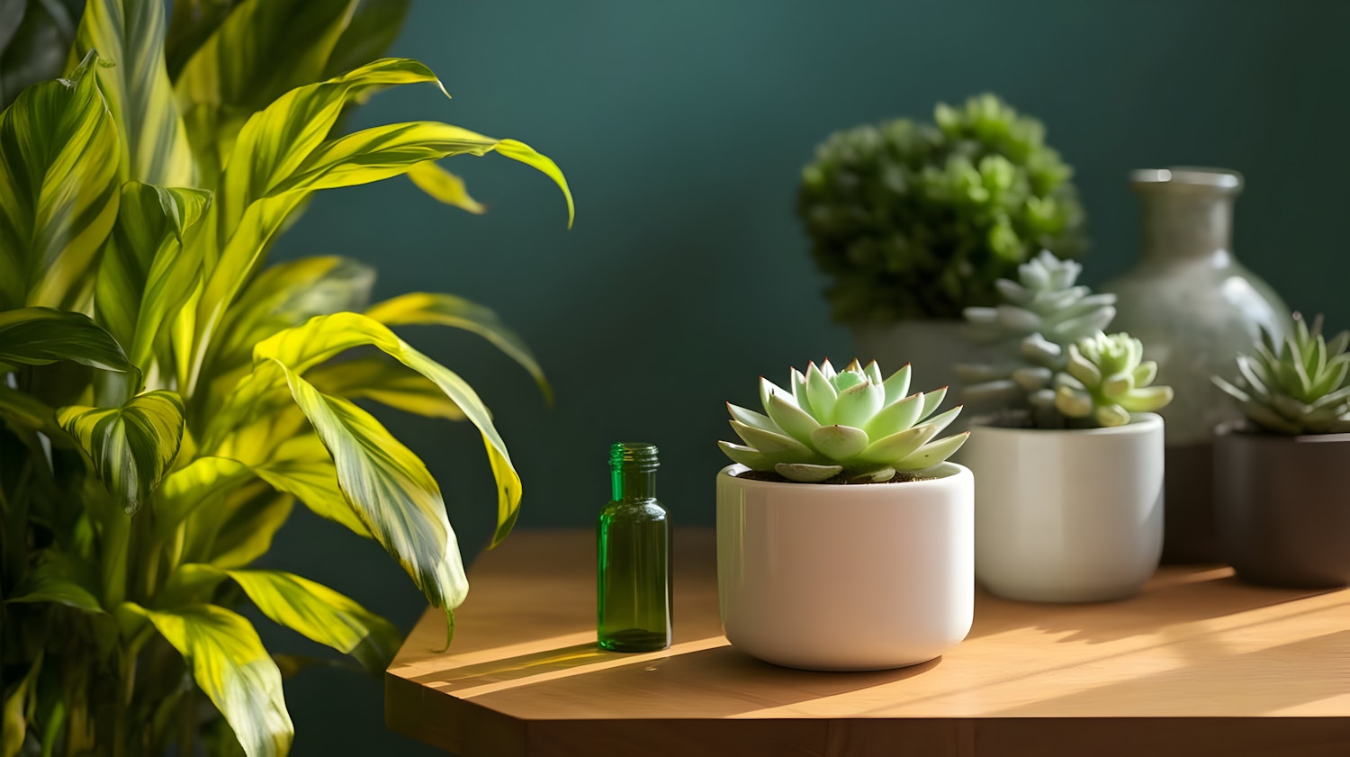 Bright indoor setup with succulents in white pots, a green glass bottle, and lush foliage on a wooden table against a green wall.