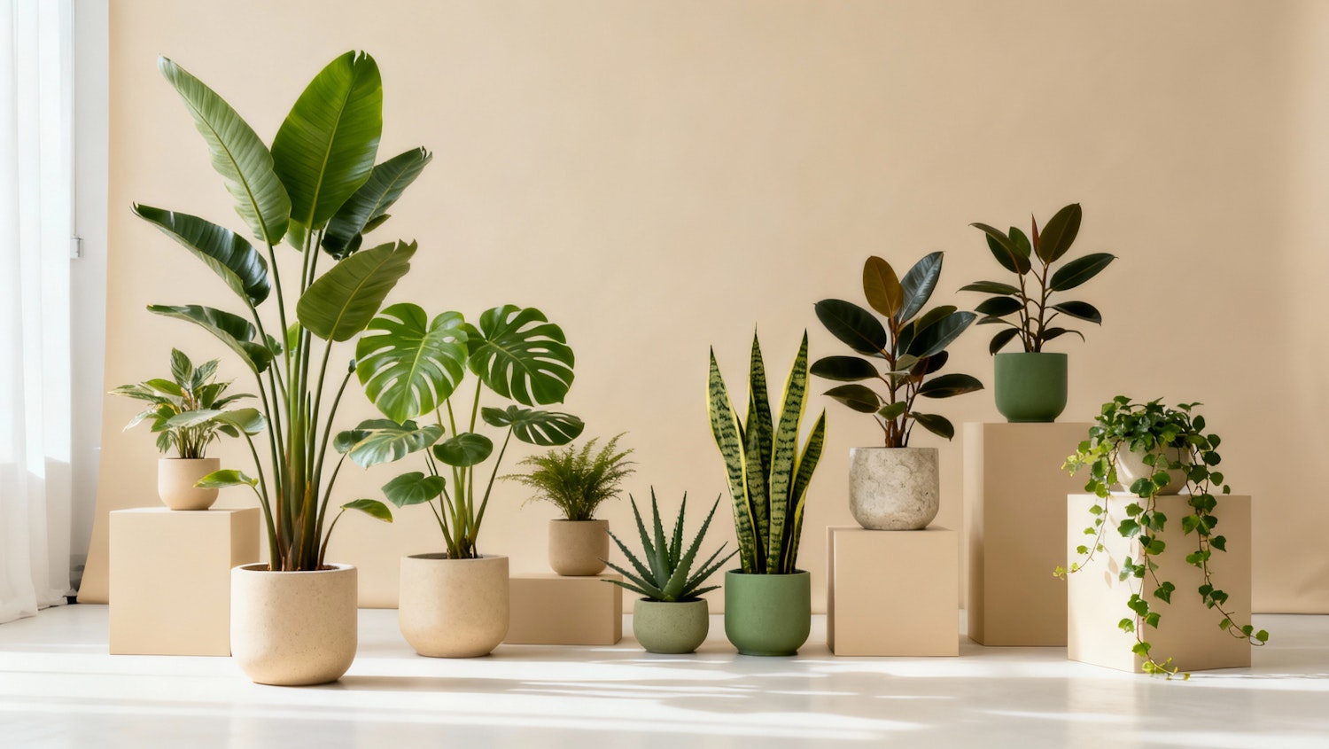 bright soft studio lighting, clean professional studio setup, smooth light beige backdrop with a matte finish, even diffused shadows, ultra realistic plant details, matte ceramic surfaces, refined composition, no people. wide composition showing a curated selection of indoor plants arranged together: a tall fiddle leaf fig, a monstera deliciosa, a snake plant, a rubber plant, an aloe vera, a calathea and a trailing vine plant. each plant placed in matte ceramic containers in tones of beige, soft stone and muted green. plants positioned at different heights using minimalist beige blocks, creating a clean balanced studio arrangement. bright, fresh, modern botanical atmosphere suitable for a website hero image