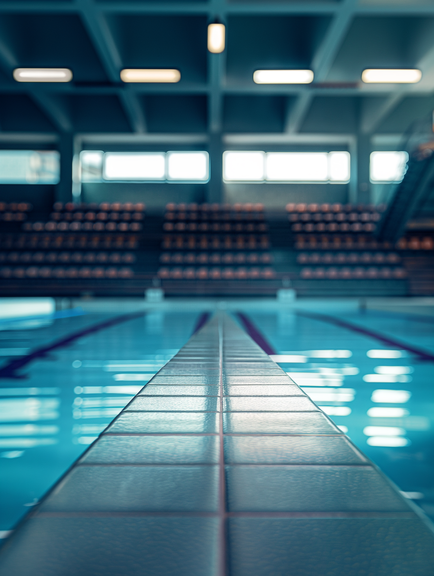 Indoor swimming pool with clear blue water, tiled edge, and empty seating. Calm atmosphere with reflections from overhead lights.