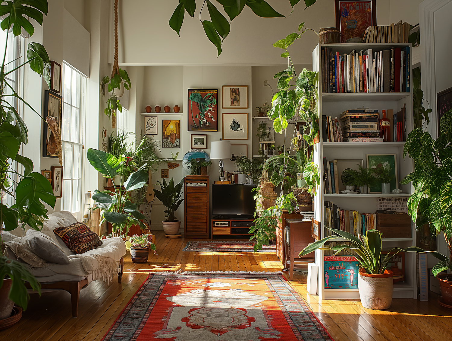 Cozy living room with lush plants, vibrant rug, and natural light. Features a comfy sofa, bookshelf, and framed artworks.