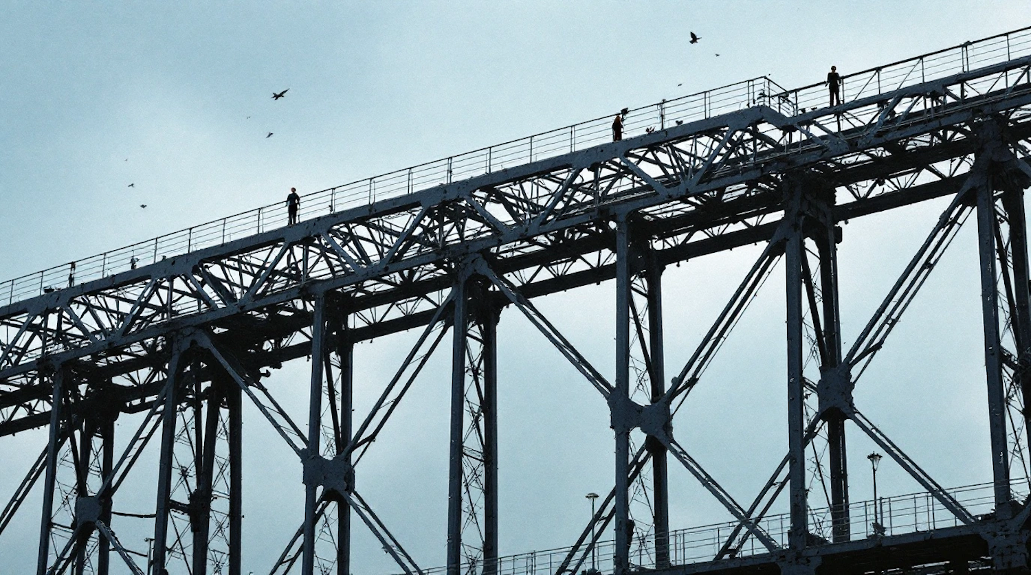 Silhouetted figures walk atop a vast steel bridge against a pale blue sky, with birds flying in the background.