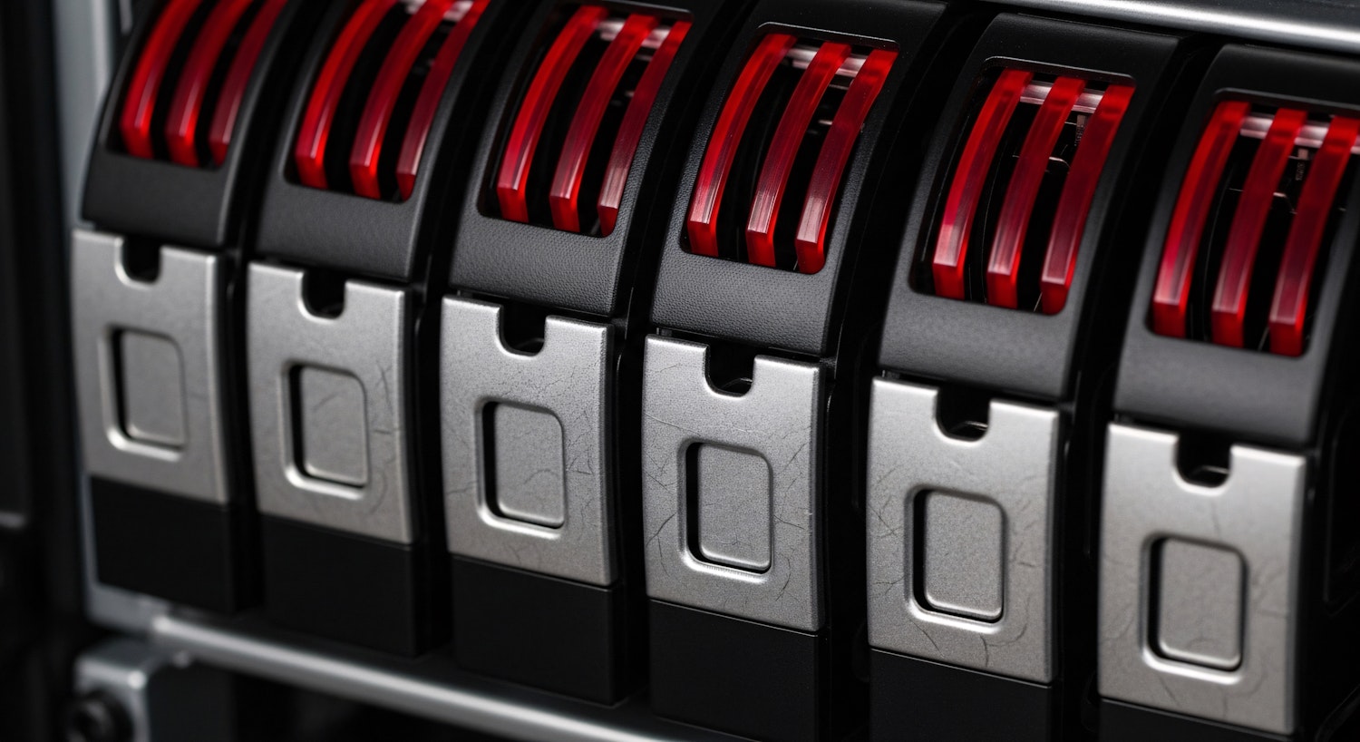 Close-up of metallic and plastic components with red accents, likely part of a mechanical or electronic device, showcasing industrial design.