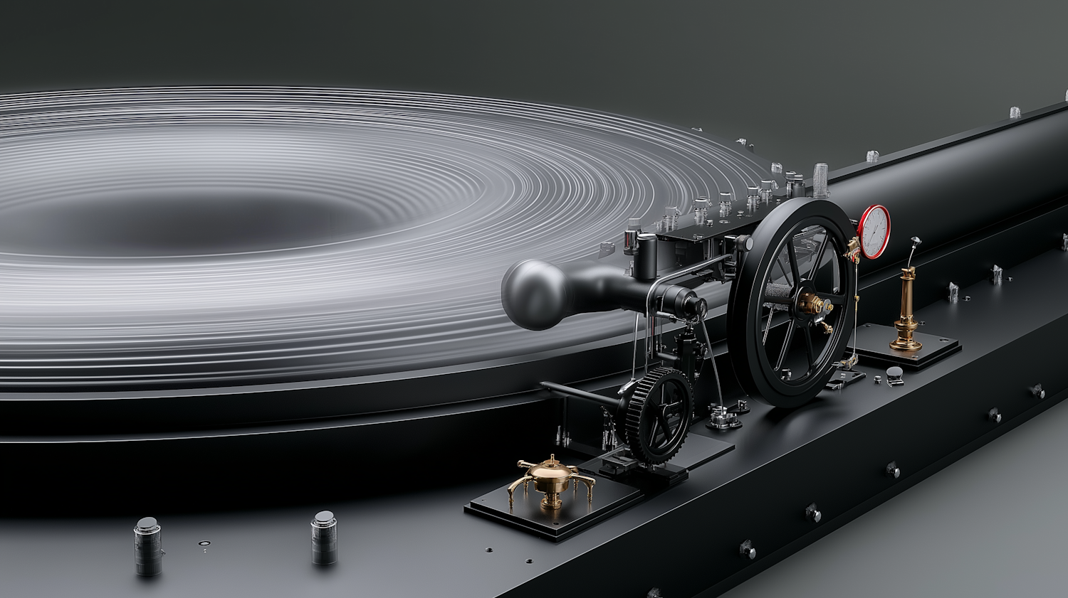 A modern industrial machine with spinning concentric rings, gears, and a vintage brass valve in a sleek black and metallic design.