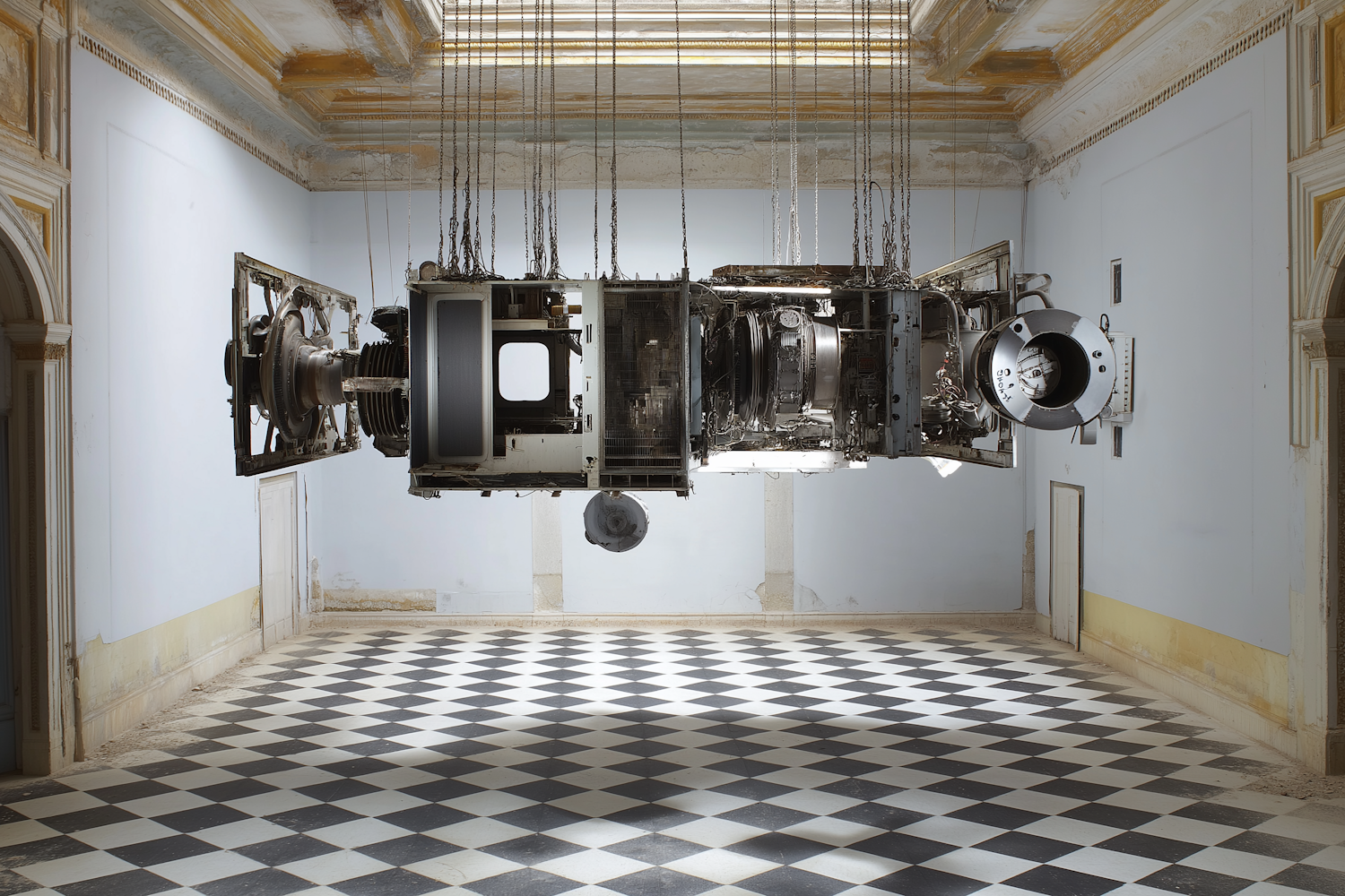 Suspended industrial turbine in a decayed ornate room with checkered floors, blending mechanical intricacy with classical architecture.