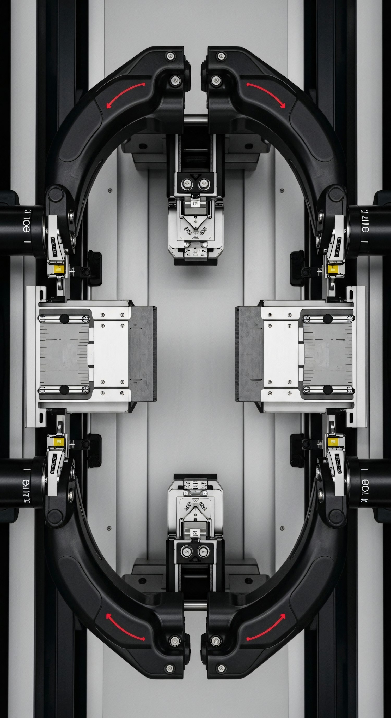 Close-up of industrial machinery with symmetrical black arms and precision-engineered components, showcasing advanced mechanical design.