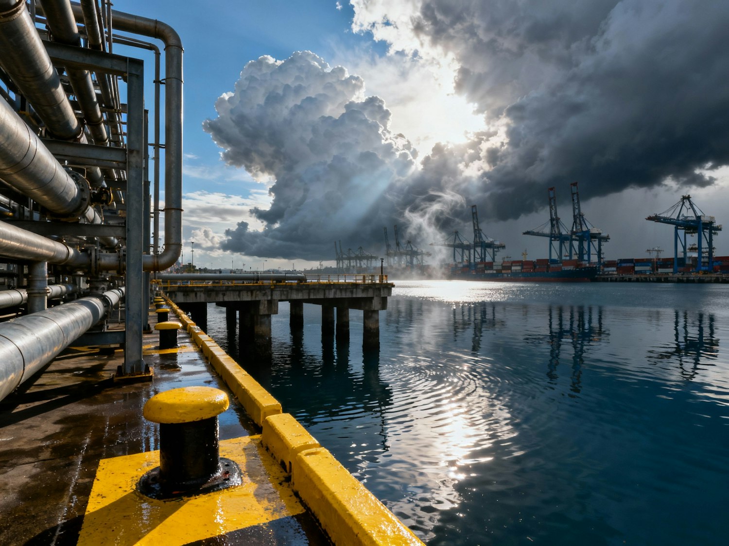 Industrial harbor service pier with pipe racks, bollards, and safety barriers, big container terminal visible across the water; storm front moving away, heavy cumulus domes lit from behind, sun ray cuts across the pier and makes wet painted metal pop, light ripples in the basin reflecting crane shapes; faint spray carried by wind. 24 mm, f/7.1, ISO 100, 1/250 s; CPL to deepen water/sky and manage shine on painted pipes — don’t over-rotate (avoid banding in water). Negative: uncorrected dull haze, over-clarity on sky edges, halo around cranes, metallic color shifts on pipes.