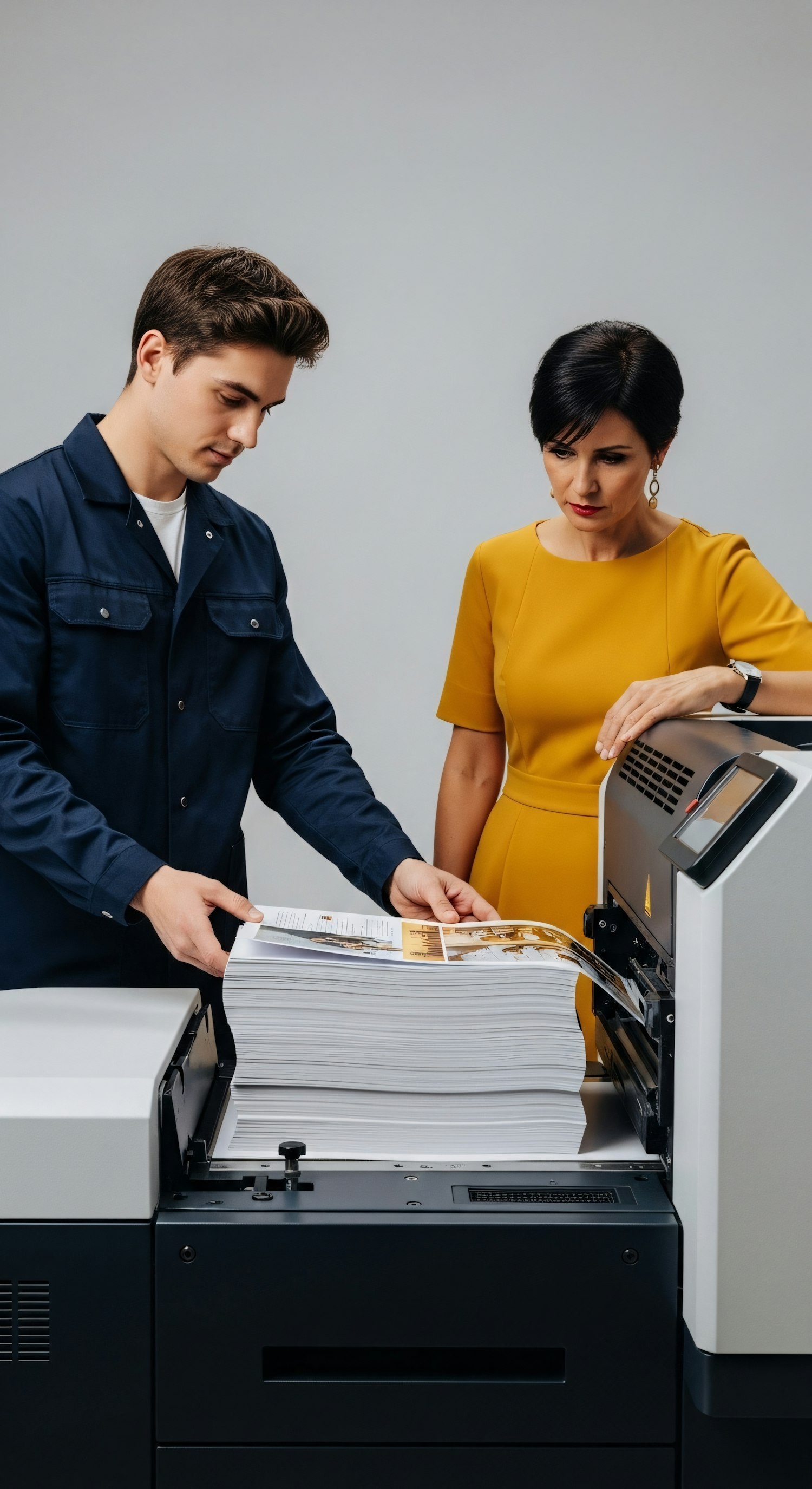 A man in a work uniform and a woman in a yellow dress inspect a stack of printed materials from an industrial printer.