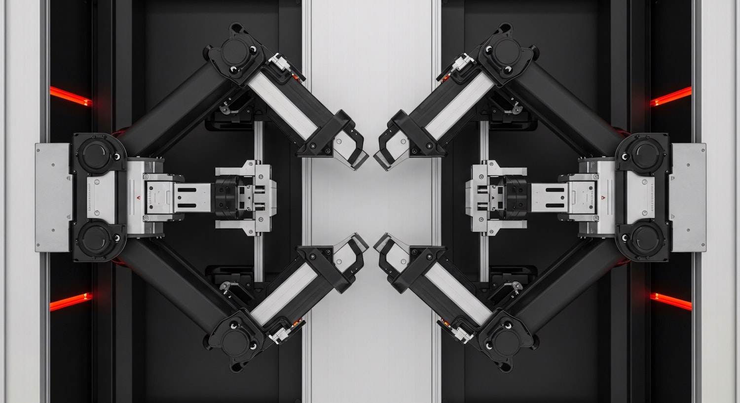 Symmetrical industrial robotic arms with precise engineering and red laser accents, showcasing advanced automation technology.