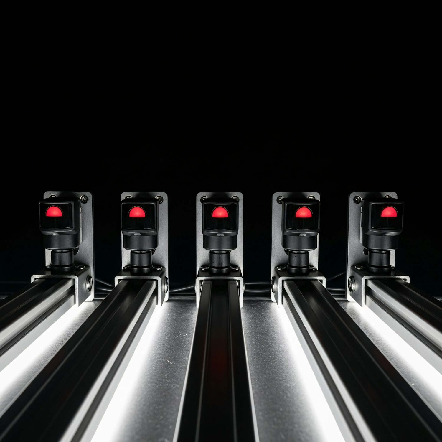 A row of five industrial sensors with red indicator lights mounted on metallic rails, set against a dark background.