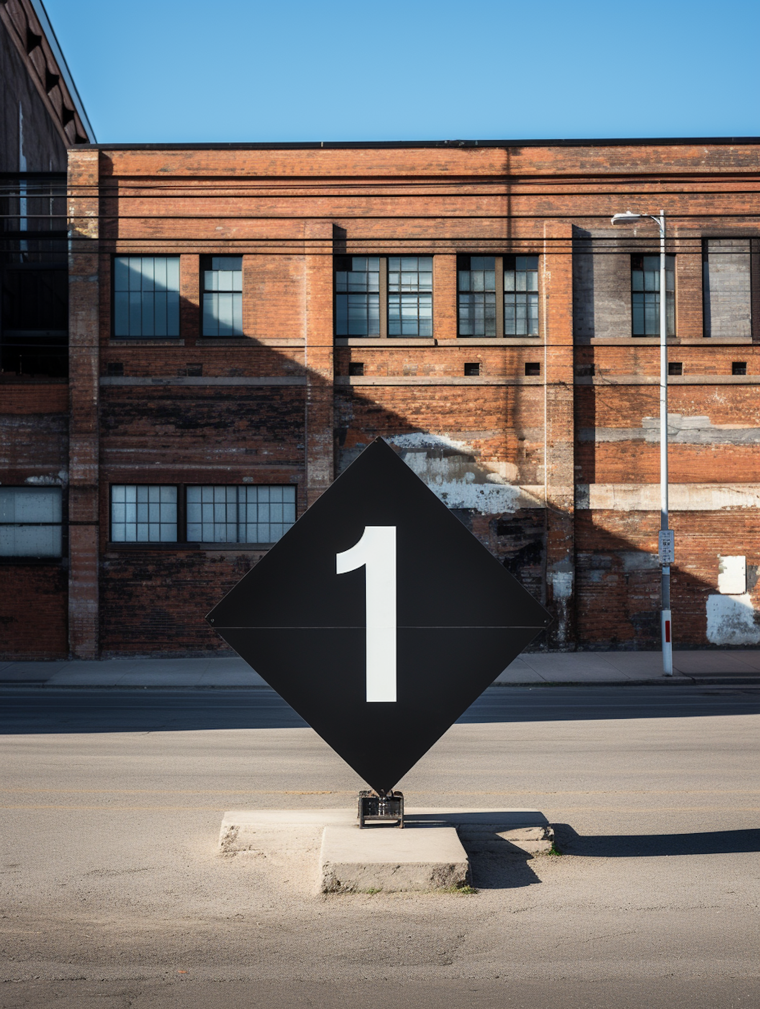 Black diamond sign with number '1' in front of a brick industrial building under a clear blue sky.
