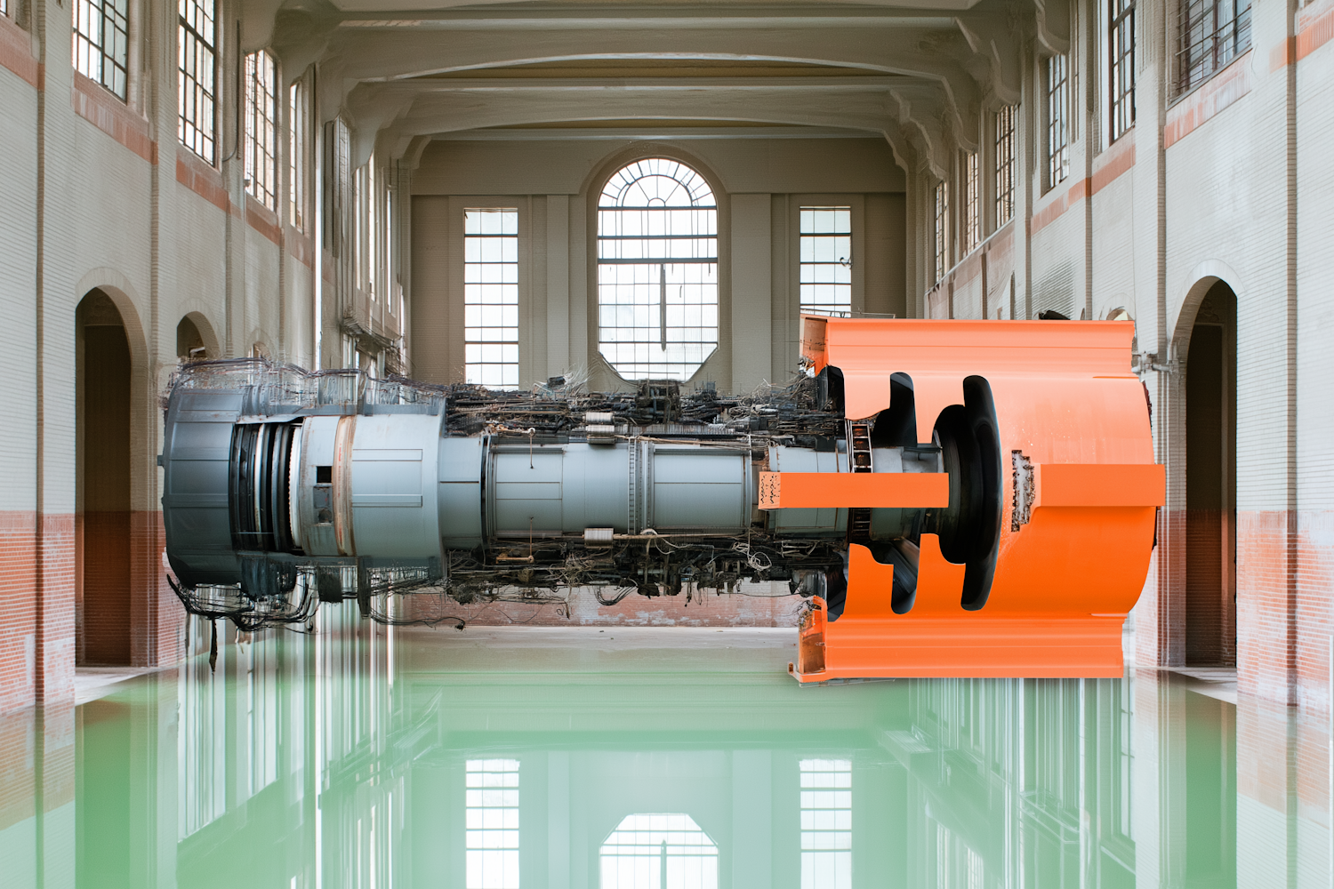 Massive industrial turbine in a high-ceilinged hall with reflective green liquid, arched windows, and a mix of metallic gray and orange.