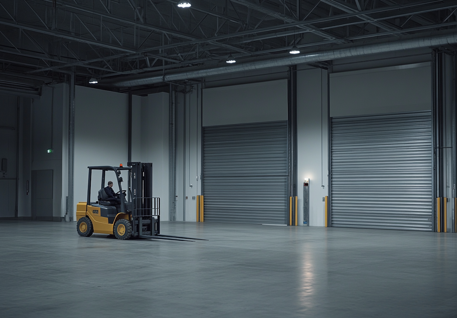 Industrial warehouse with a yellow forklift and metallic roll-up doors, showcasing a clean and spacious interior.