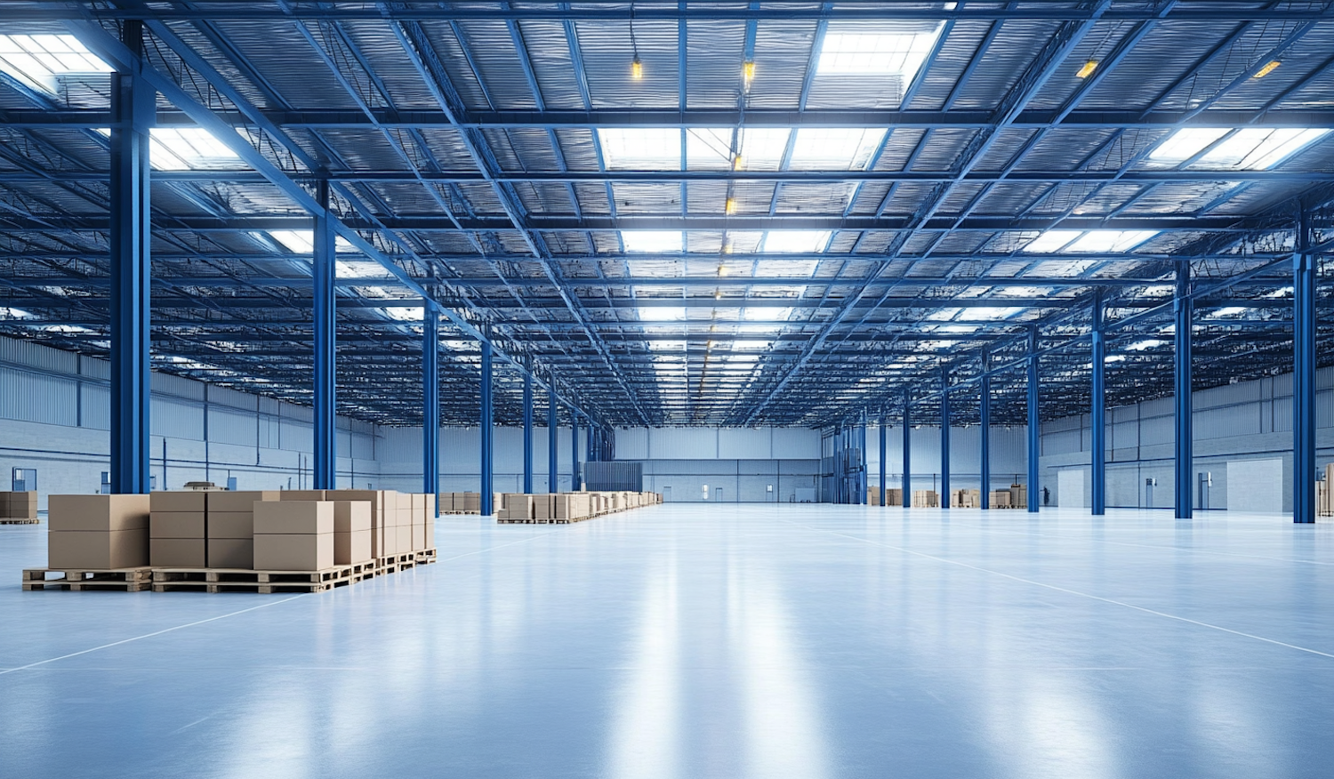 Spacious modern warehouse with blue steel beams, polished floors, and neatly stacked boxes on pallets under skylights.