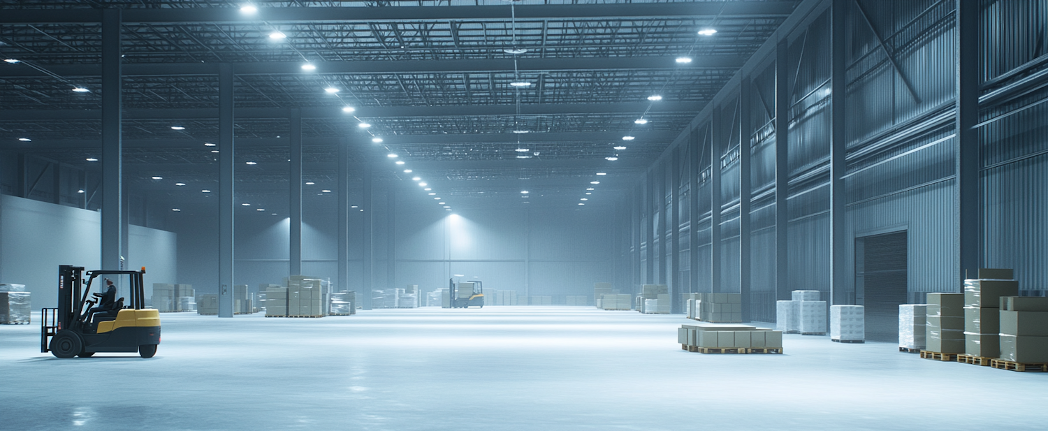 Spacious modern warehouse with forklifts and neatly stacked pallets, illuminated by bright overhead lights.
