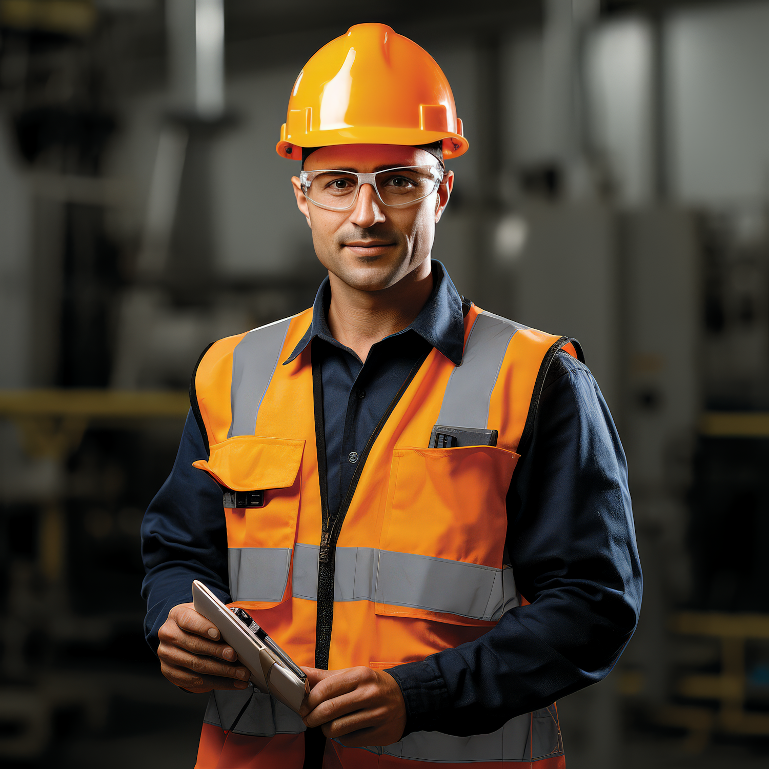 Construction worker in safety gear holding a tablet in an industrial setting, showcasing modern technology in construction.