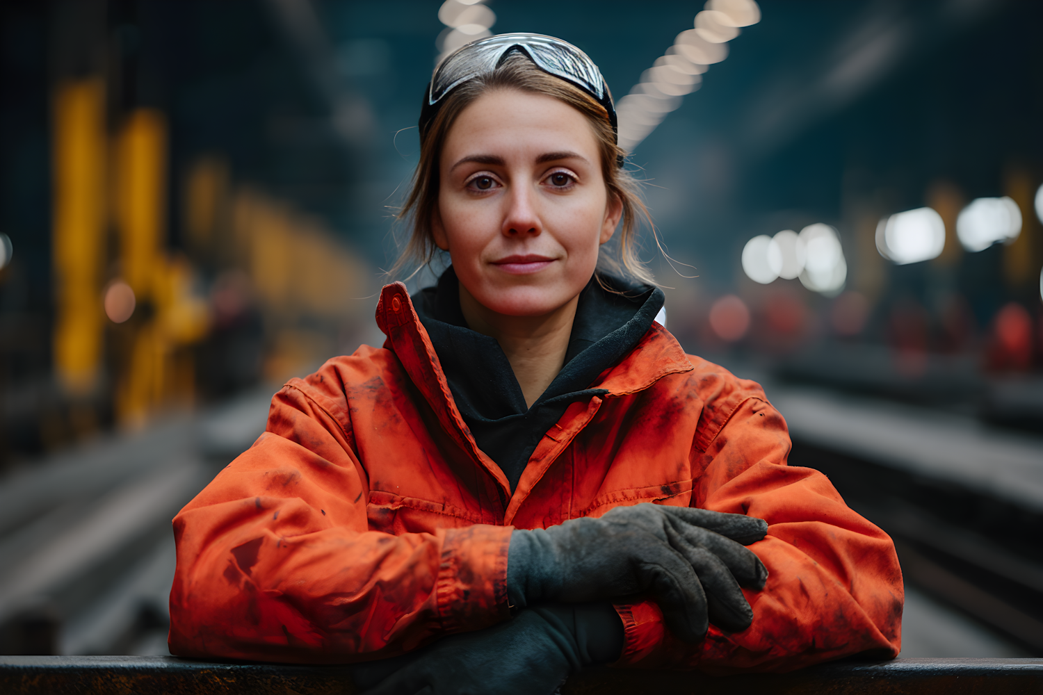 A woman in an orange work jacket and gloves stands in an industrial setting, exuding confidence and professionalism.