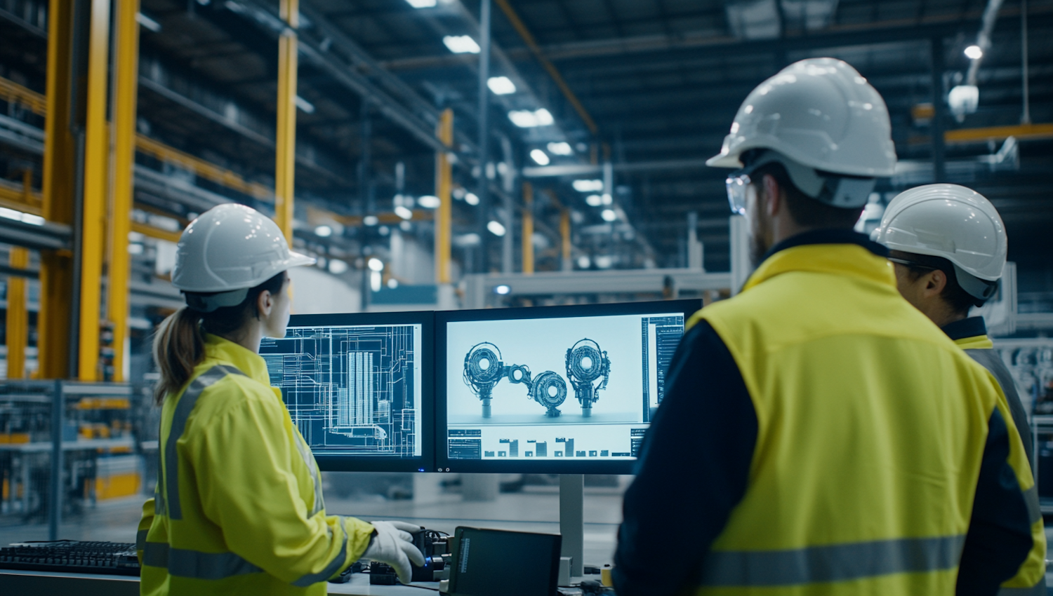 Engineers in a factory analyze technical schematics on dual monitors, wearing hard hats and safety vests in a modern industrial setting.