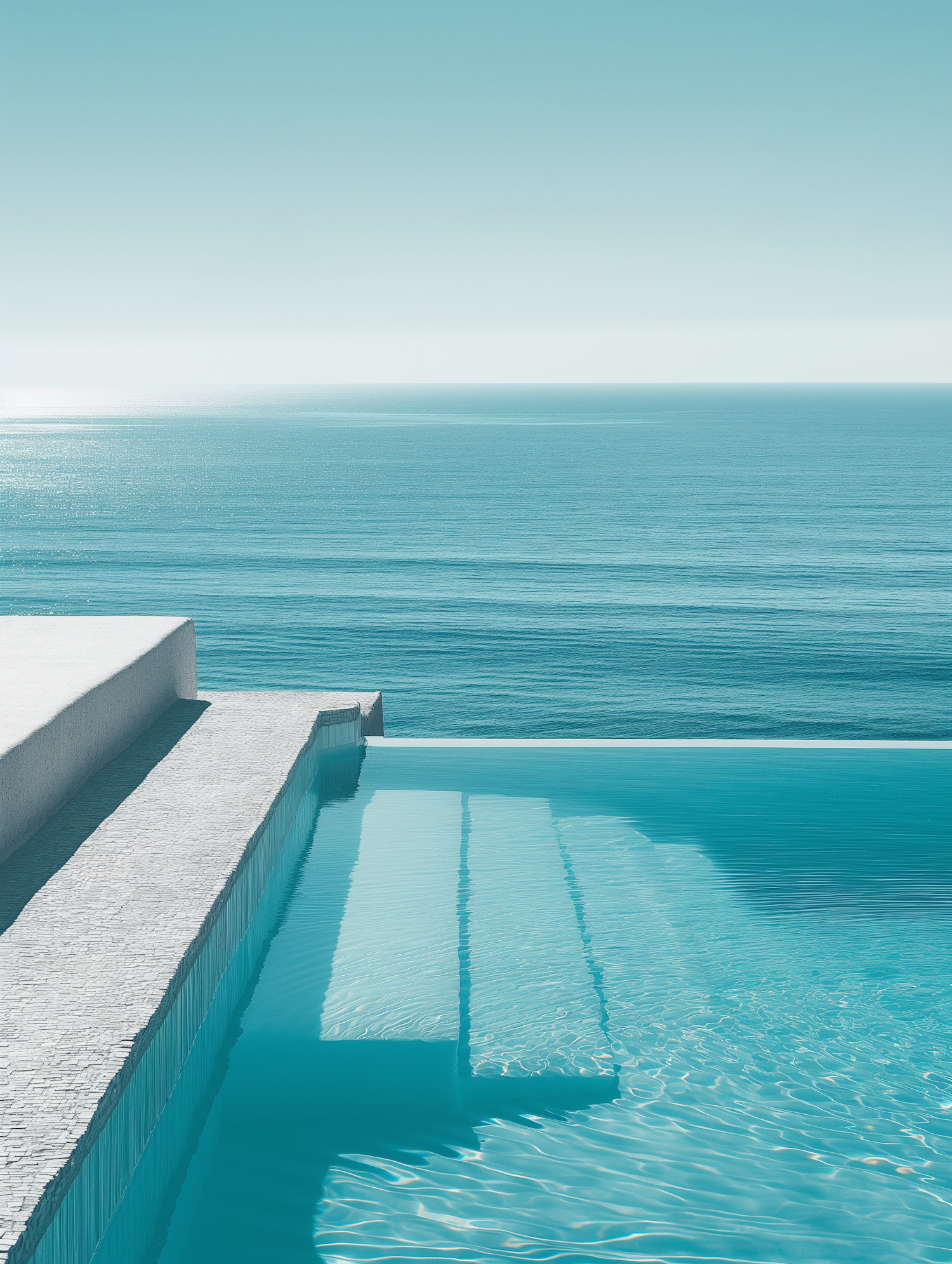 Infinity pool merges with ocean, creating a tranquil scene with turquoise waters and a seamless horizon.