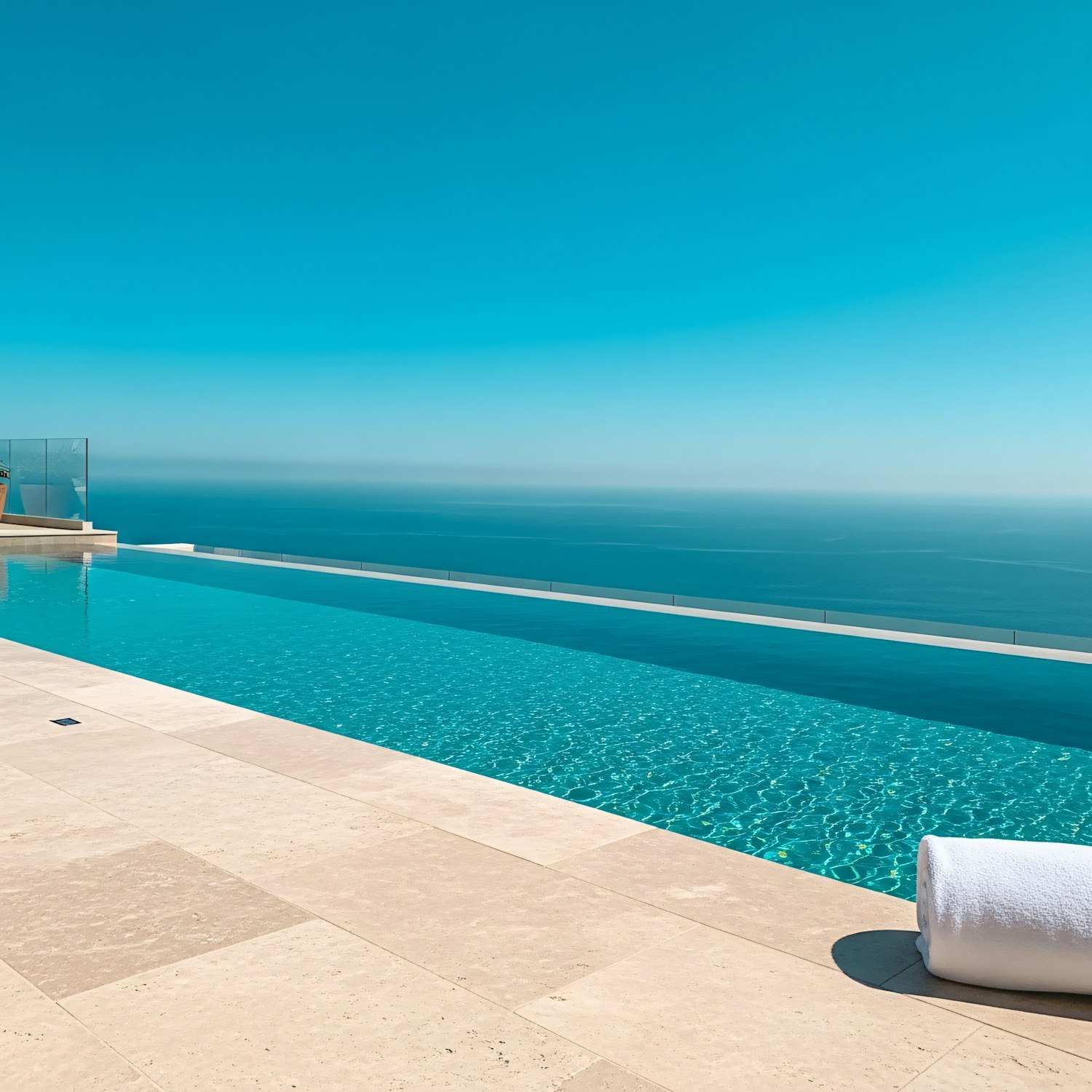 Infinity pool with ocean view under a clear blue sky, featuring a serene atmosphere and a luxurious poolside setting.