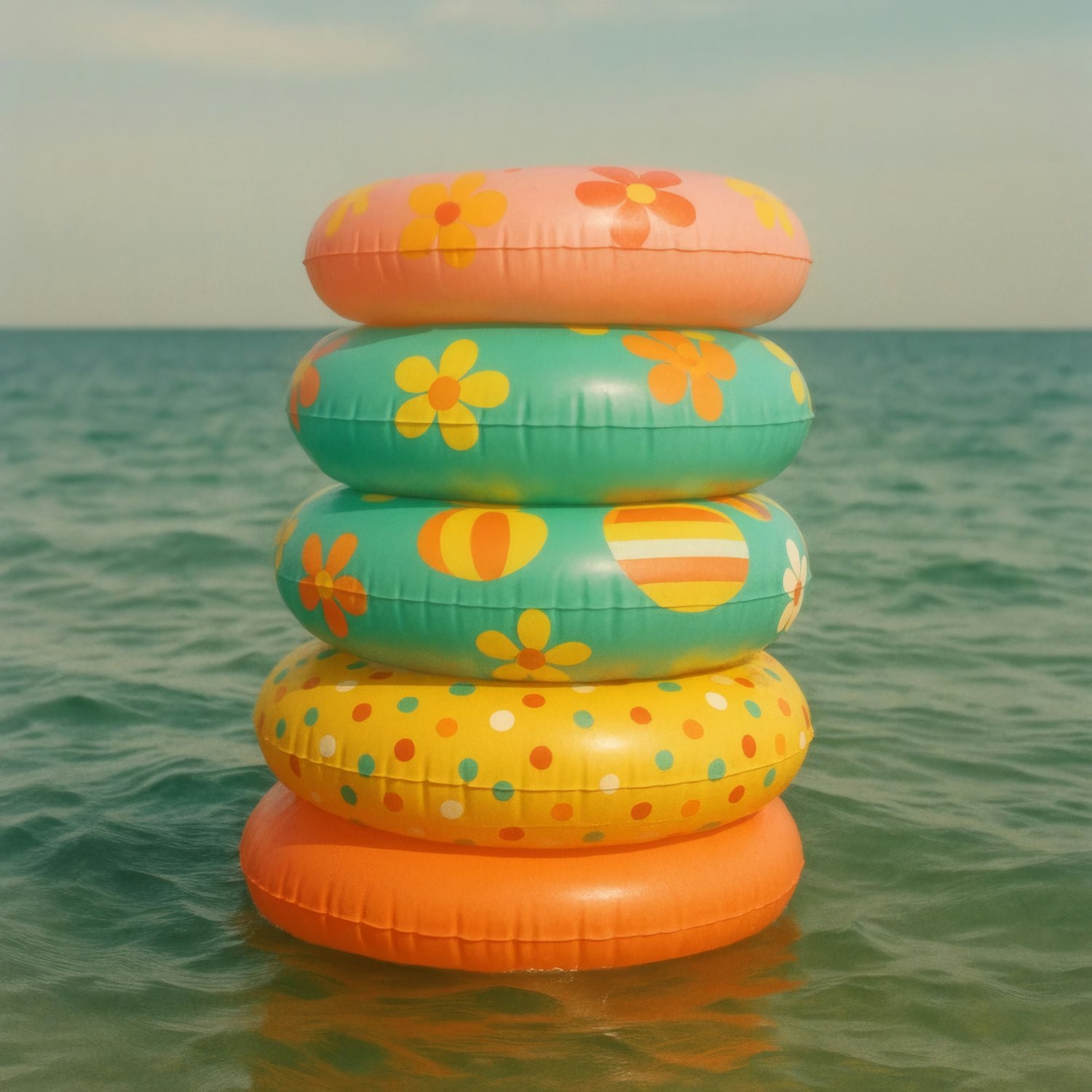 A stack of colorful inflatable rings with floral patterns floating in calm ocean water under clear skies, evoking a relaxing summer vibe.