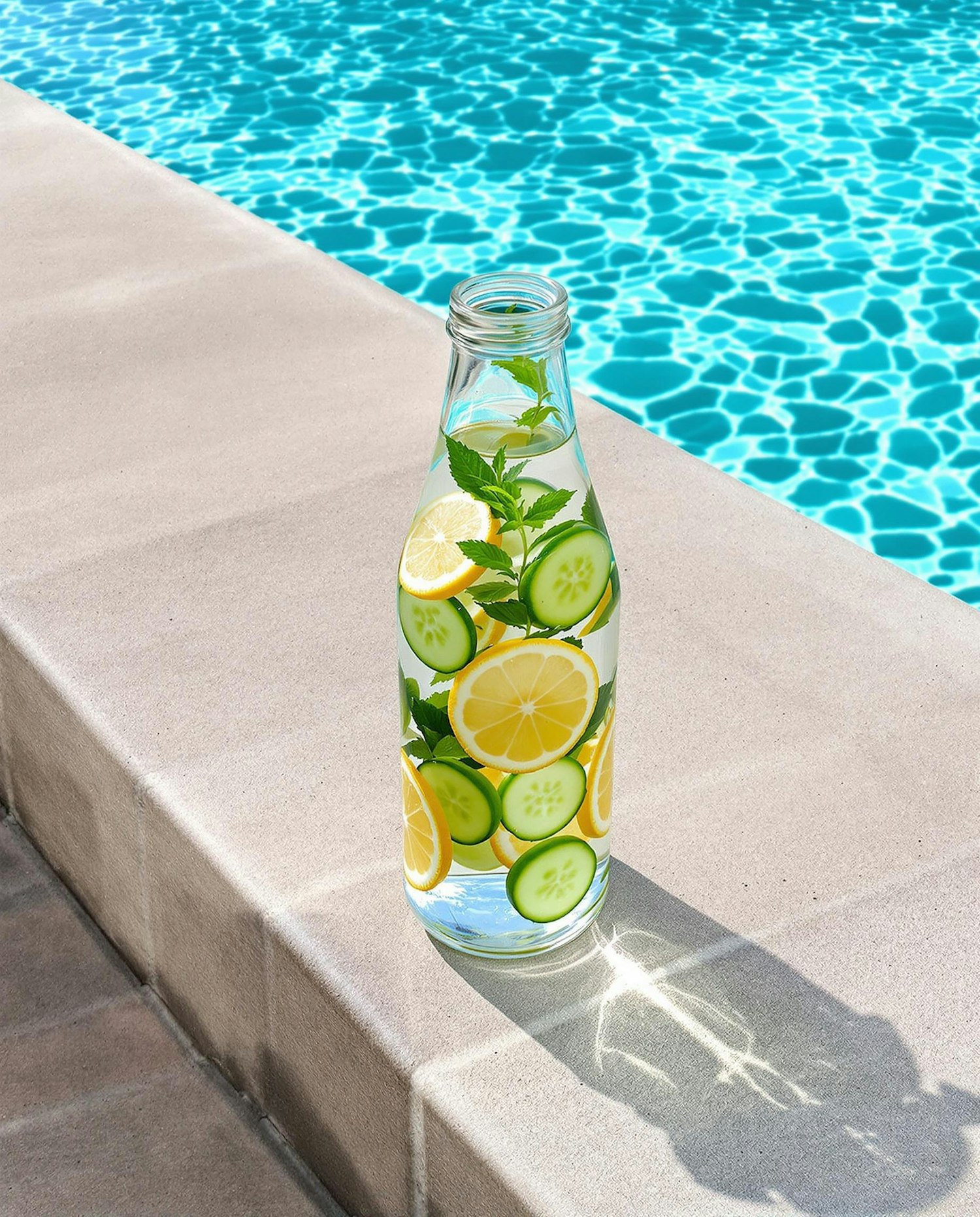 A glass bottle of lemon, cucumber, and mint-infused water sits poolside, with shimmering blue water in the background. Refreshing summer vibes!