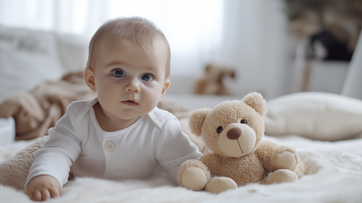 Adorable baby with blue eyes and a teddy bear on a soft bed, creating a cozy and heartwarming scene.