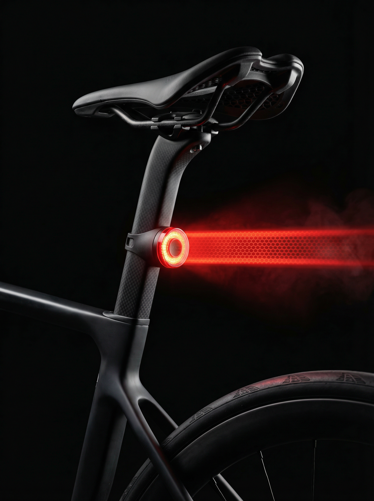 Close-up of a bicycle seat and frame with a red safety light emitting a beam, highlighting modern design and nighttime visibility.