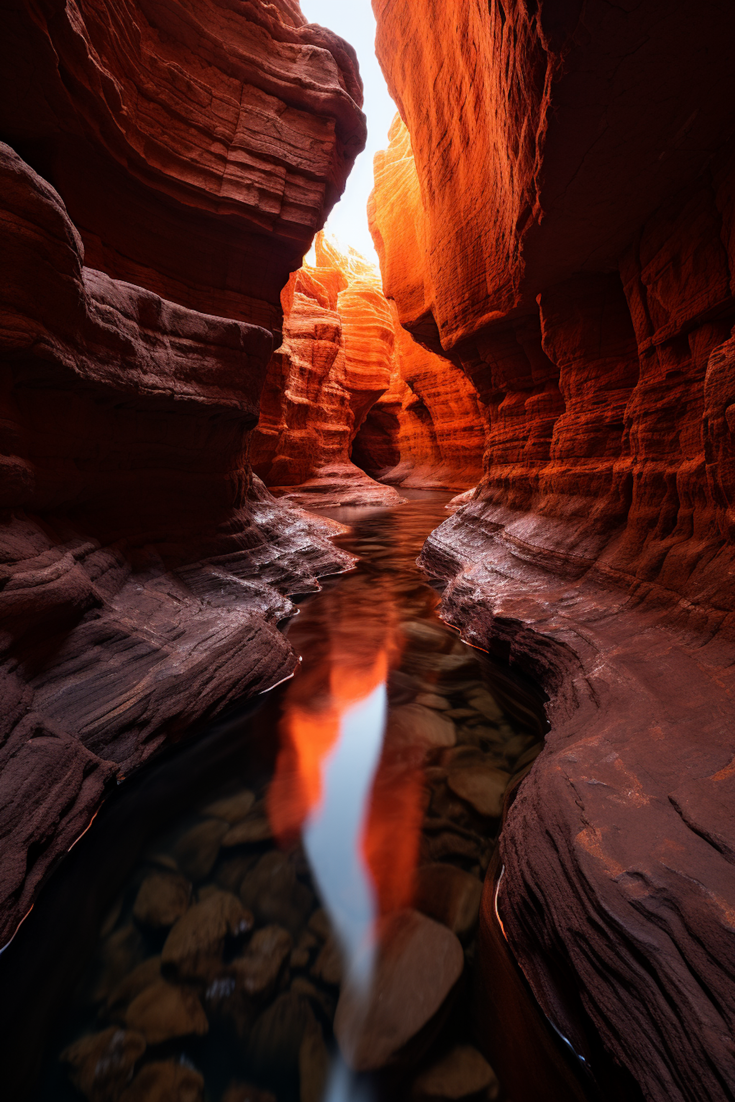 Explore a breathtaking narrow canyon with towering red rock walls and a serene stream reflecting vibrant colors.