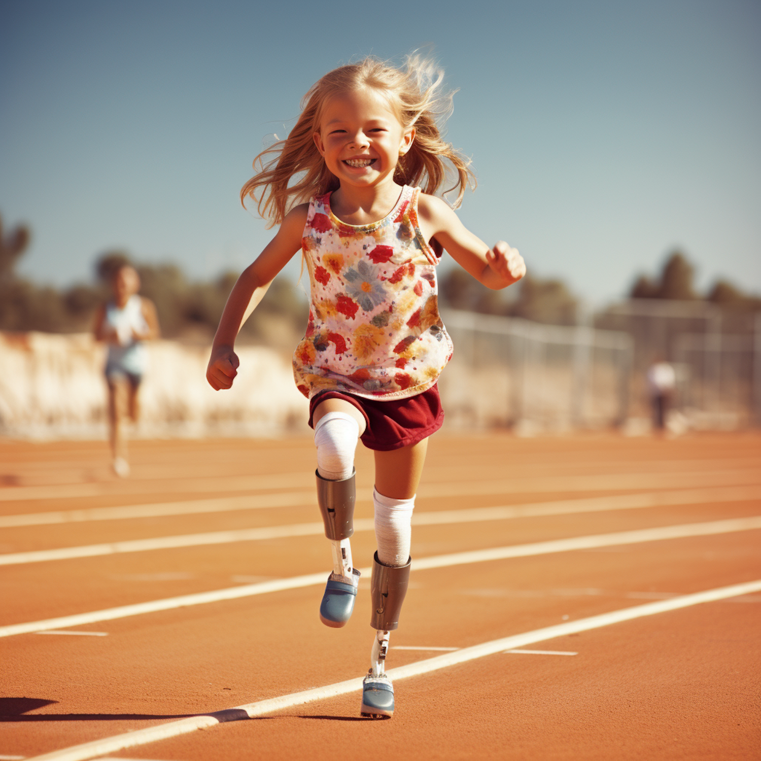 Joyful young girl with prosthetic legs running on a sunny track, wearing a floral top and red shorts, exuding happiness and determination.