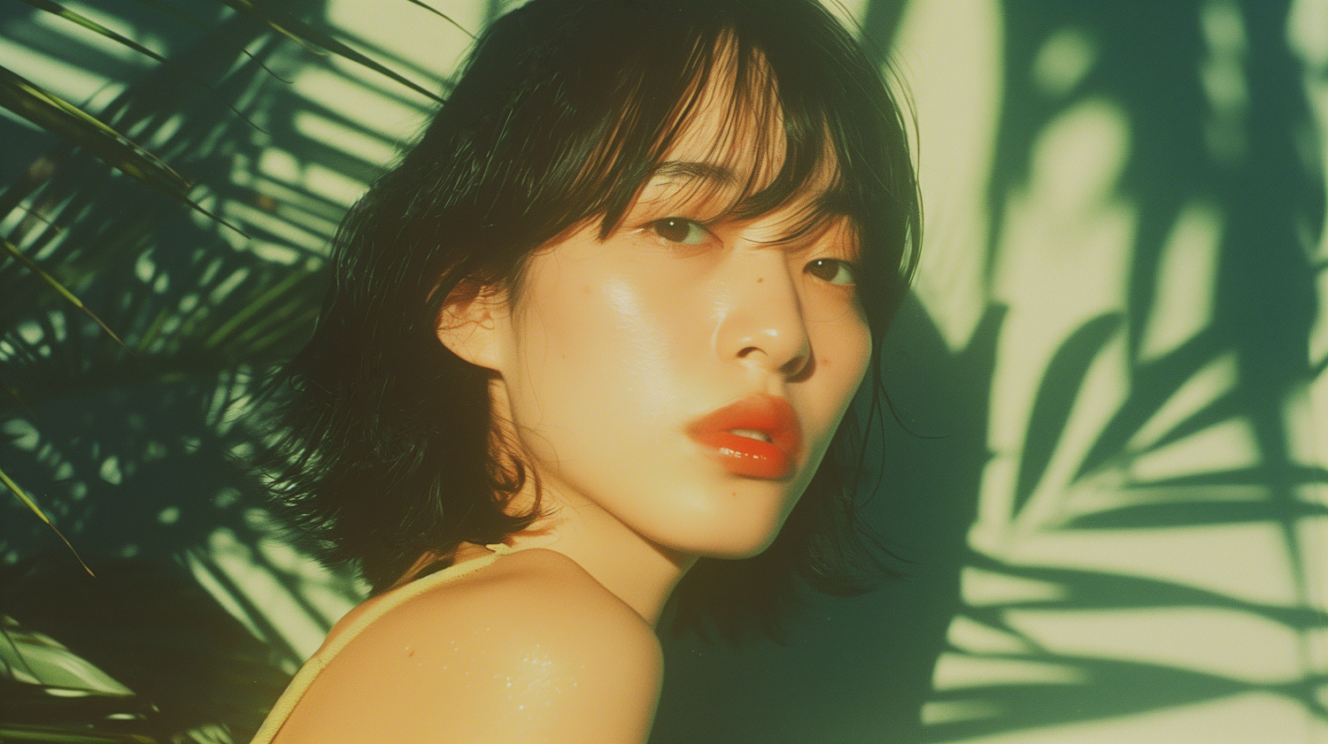 Asian woman with short black hair and red lips, bathed in warm light with palm leaf shadows. A serene, tropical vibe.