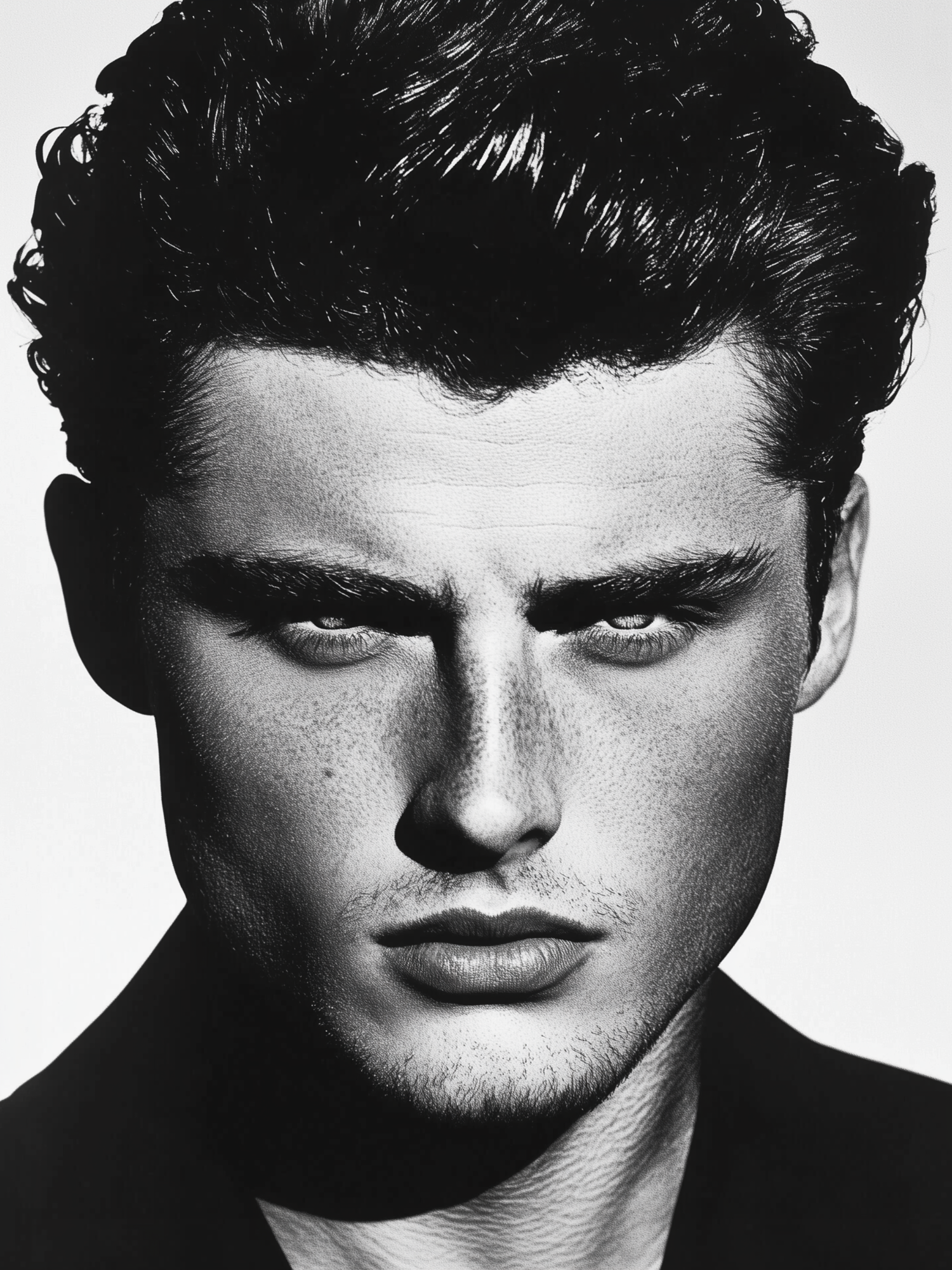 Black and white portrait of a man with intense expression, dark hair, and strong lighting contrasts highlighting facial features.