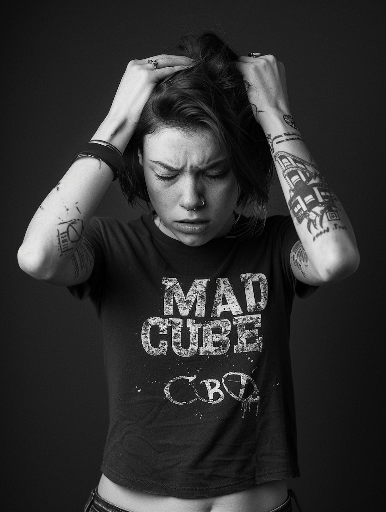 Black-and-white portrait of a tattooed woman in distress, wearing a 'MAD CUBE' t-shirt, with a dark background.