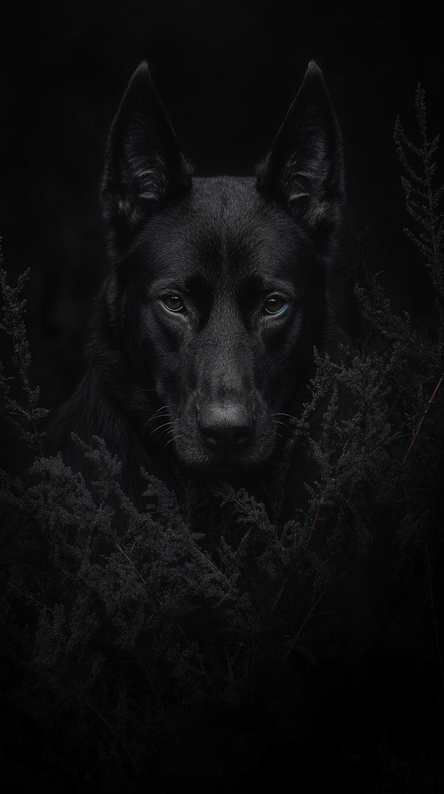 A black dog with pointed ears and intense gaze amidst dark foliage, creating a mysterious and captivating atmosphere.