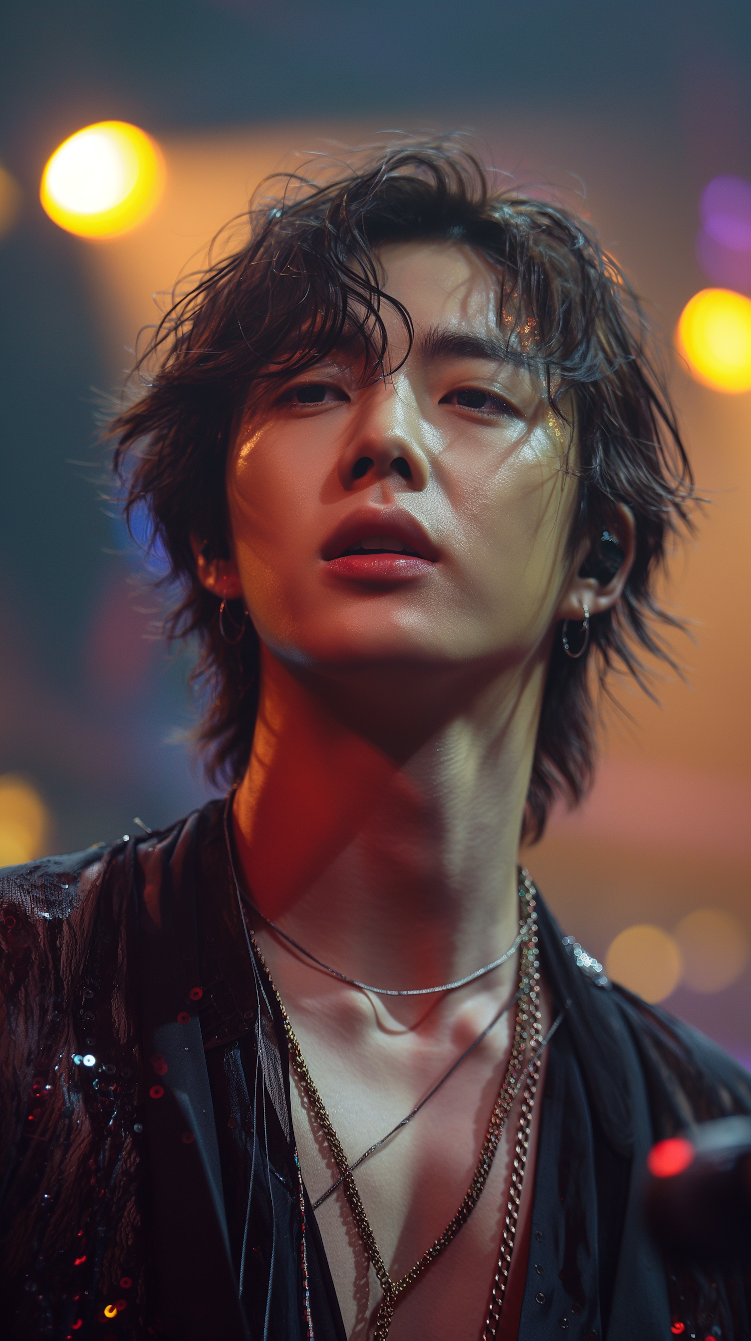 Asian male with tousled hair and layered necklaces in a dramatic, colorful stage setting.
