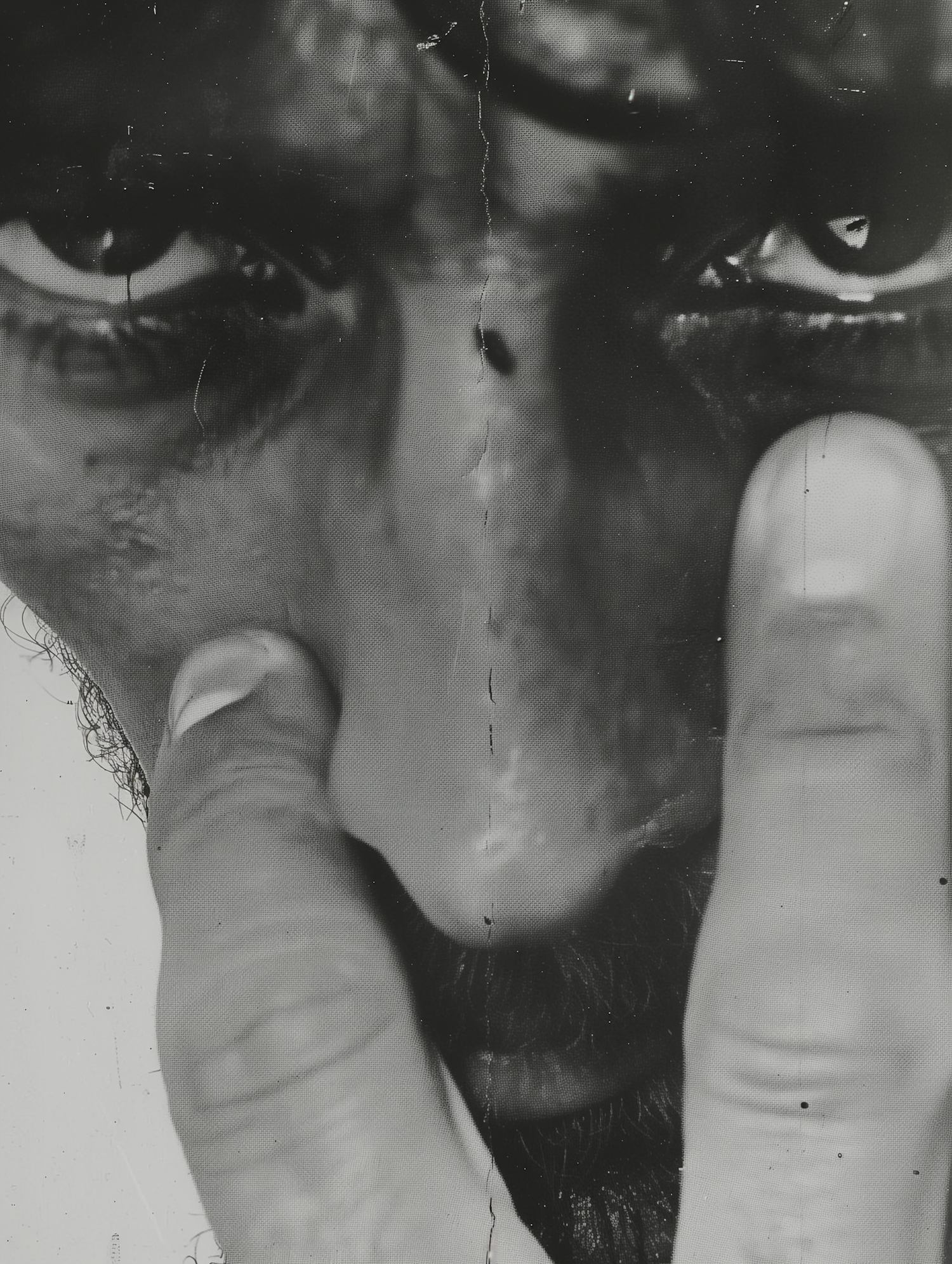 Intense black and white close-up of a face with piercing eyes and a hand partially covering it, evoking introspection.