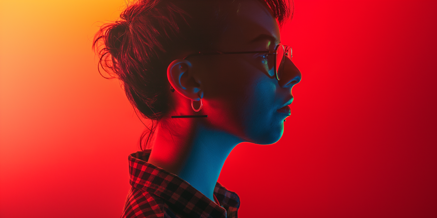 Profile of a person with glasses in vibrant red and blue lighting, wearing a checkered shirt. Artistic and modern composition.