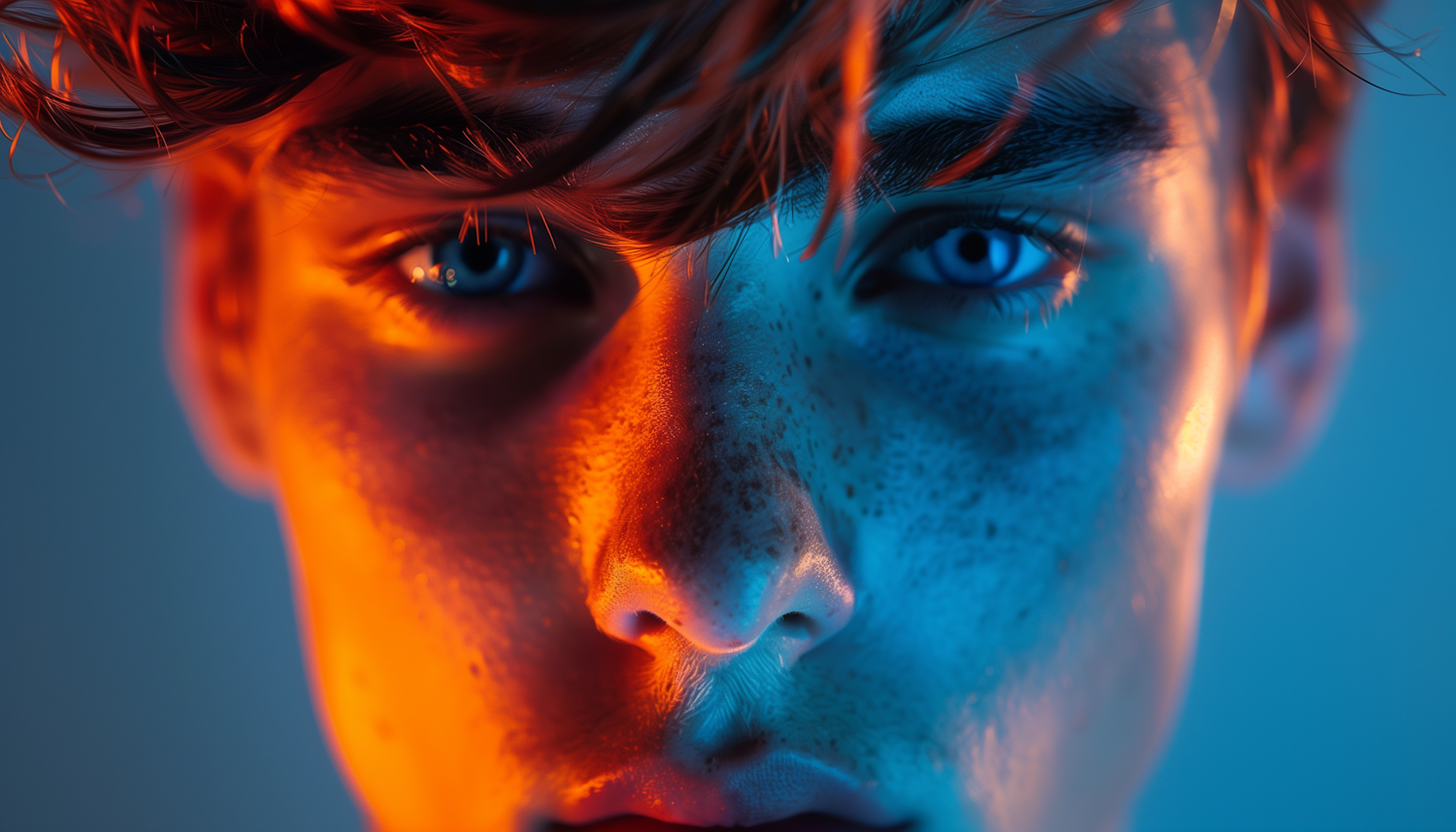 Close-up portrait of a young male with dramatic orange and blue lighting, highlighting his freckles and intense gaze.