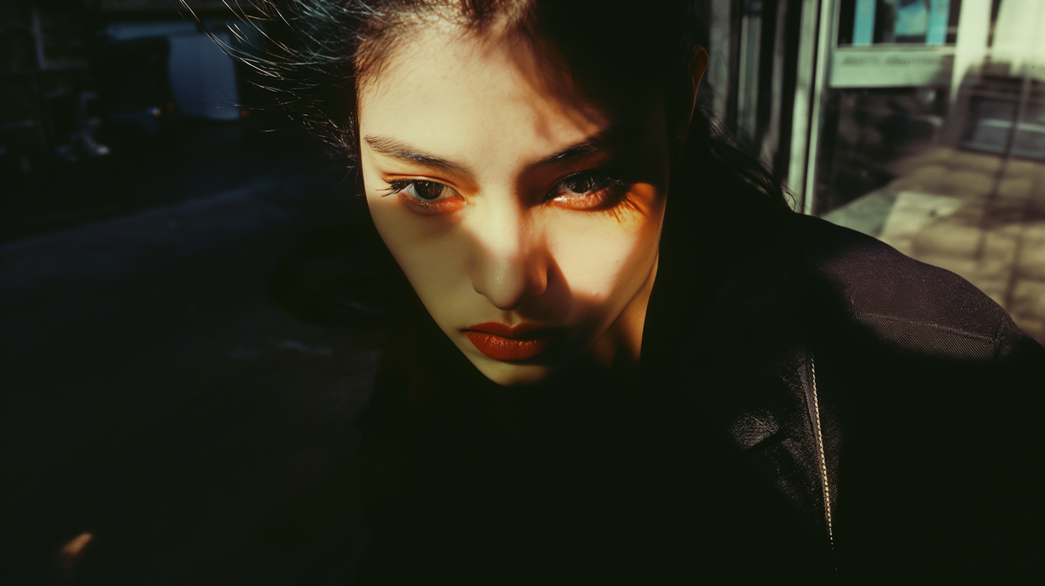 Dramatic portrait of a young woman with intense expression, highlighted by striking shadows and urban background.