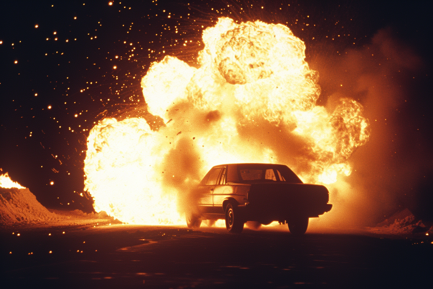 A dark sedan silhouetted against a fiery explosion at night, with sparks and debris scattering in dramatic fashion.