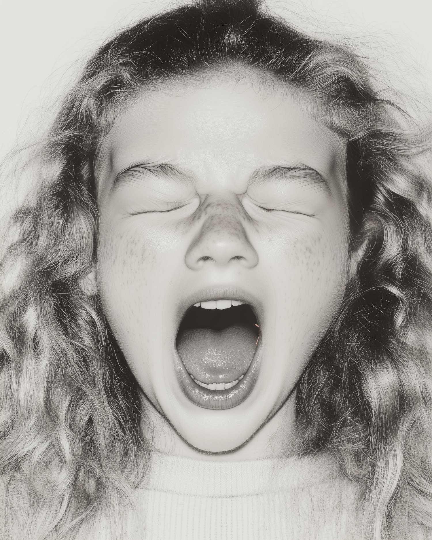 Black and white close-up of a young person with curly hair, eyes closed, mouth open, expressing intensity. High contrast and texture.