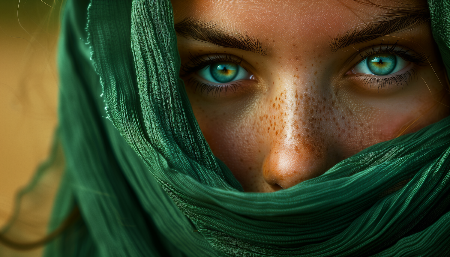 Close-up of striking blue-green eyes framed by a green scarf, with freckles and a blurred background enhancing the focus.