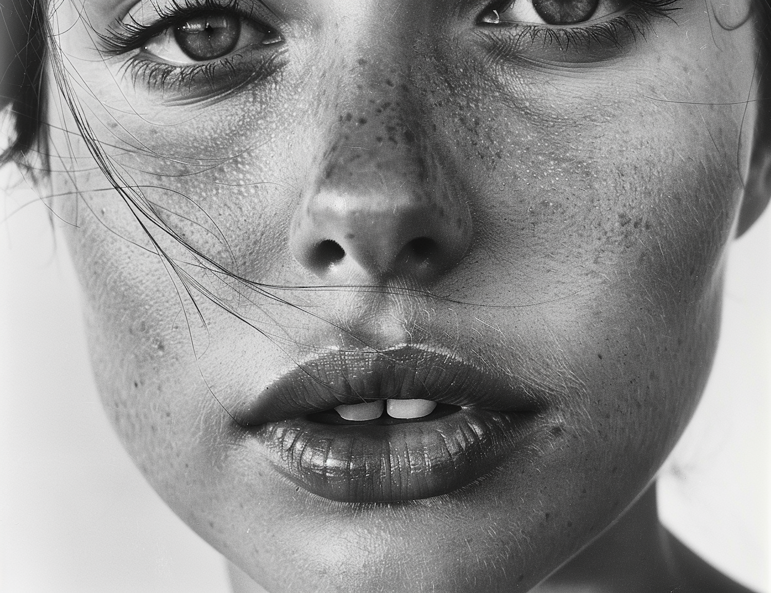 Close-up black and white portrait of a woman's face with freckles, textured skin, and parted lips, highlighting her eyes and natural beauty.
