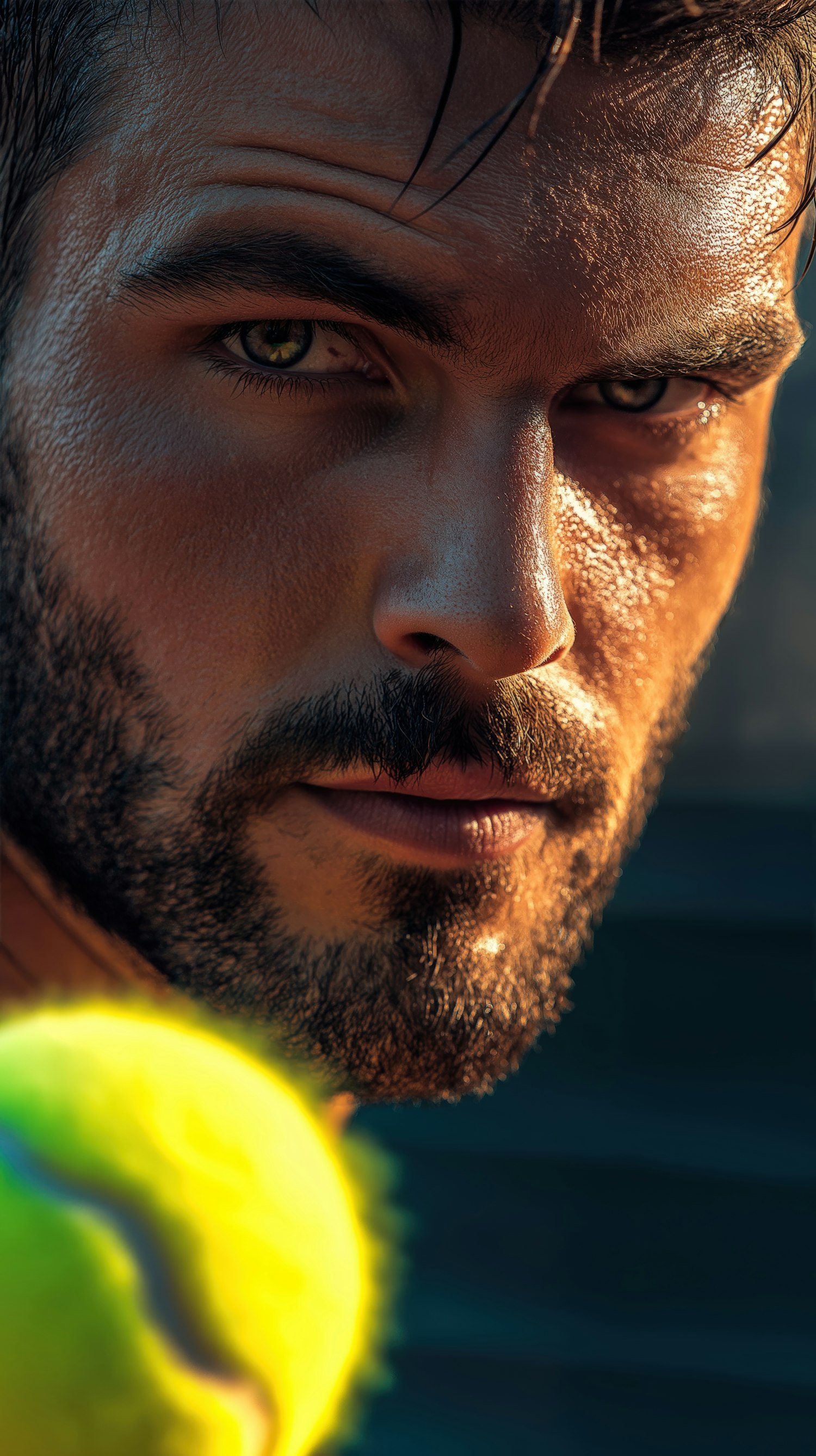 Close-up of a rugged man with intense green eyes and a tennis ball in focus, highlighting athleticism and determination.