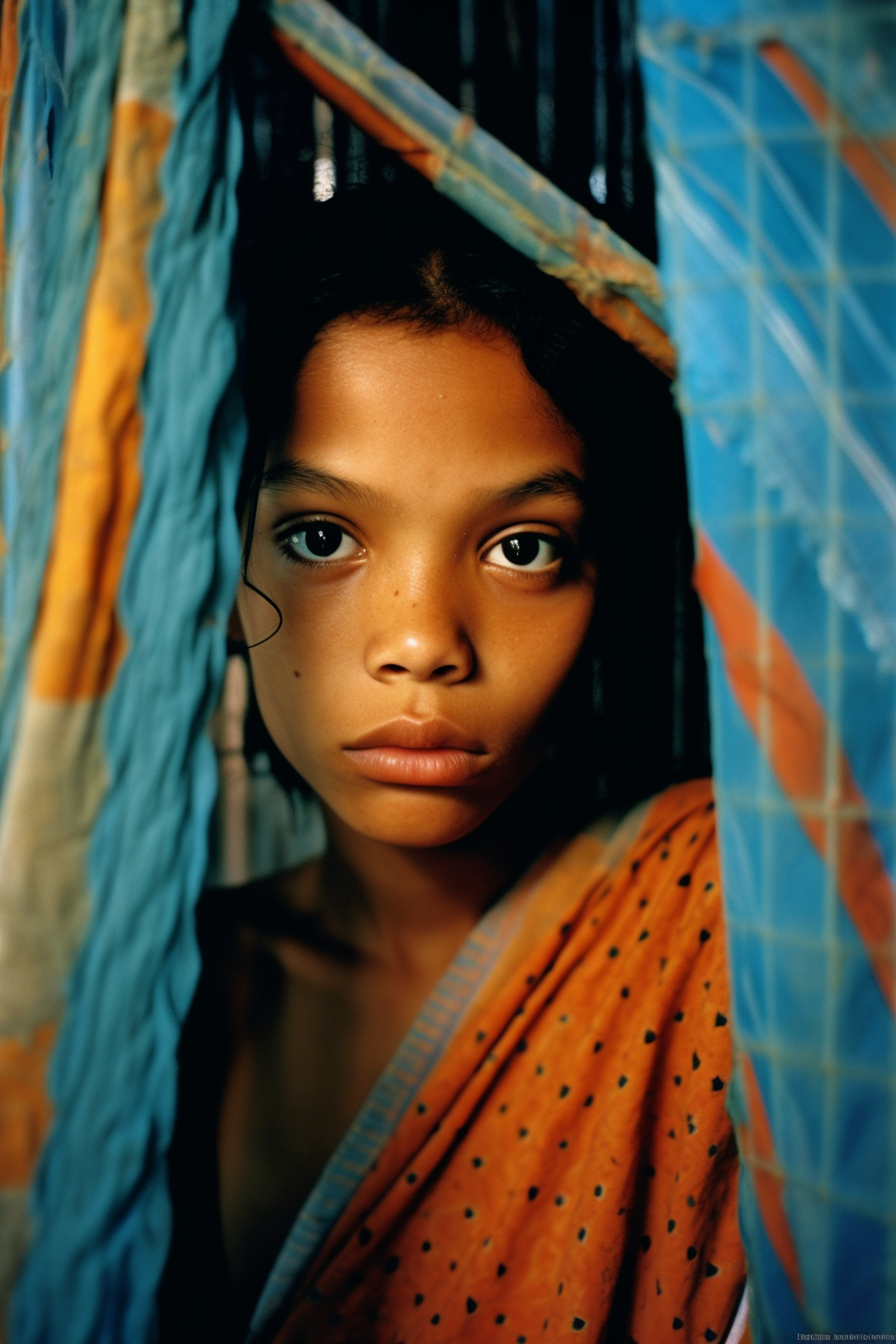 Portrait of a young girl with deep brown eyes, wrapped in vibrant orange fabric, framed by blue and orange draped textiles.