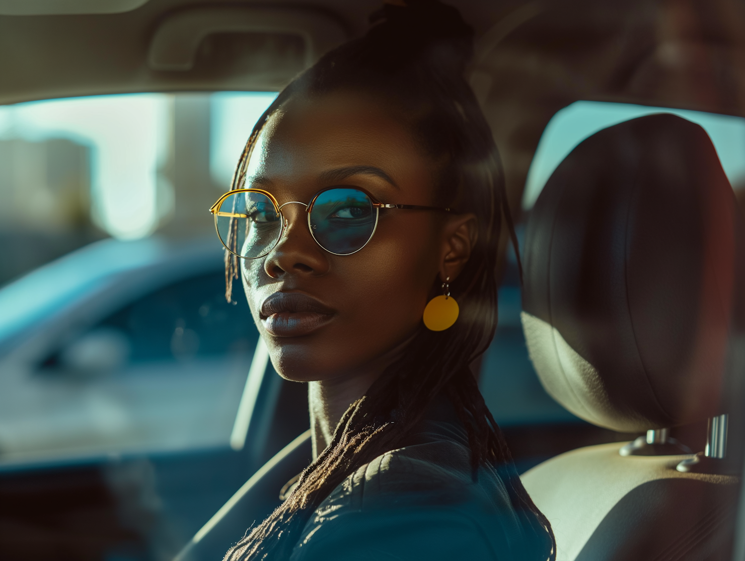 Stylish woman with glasses and yellow earrings in a car, cityscape in the background. Warm sunlight highlights her confident expression.