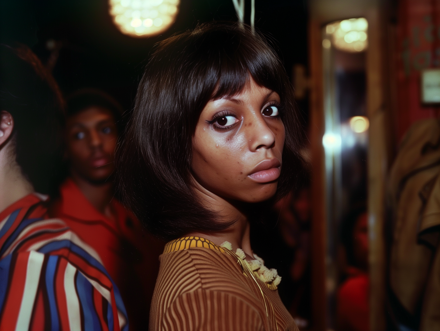 A young woman with a sleek bob and expressive eyes stands in warm lighting, creating a captivating and intimate portrait.