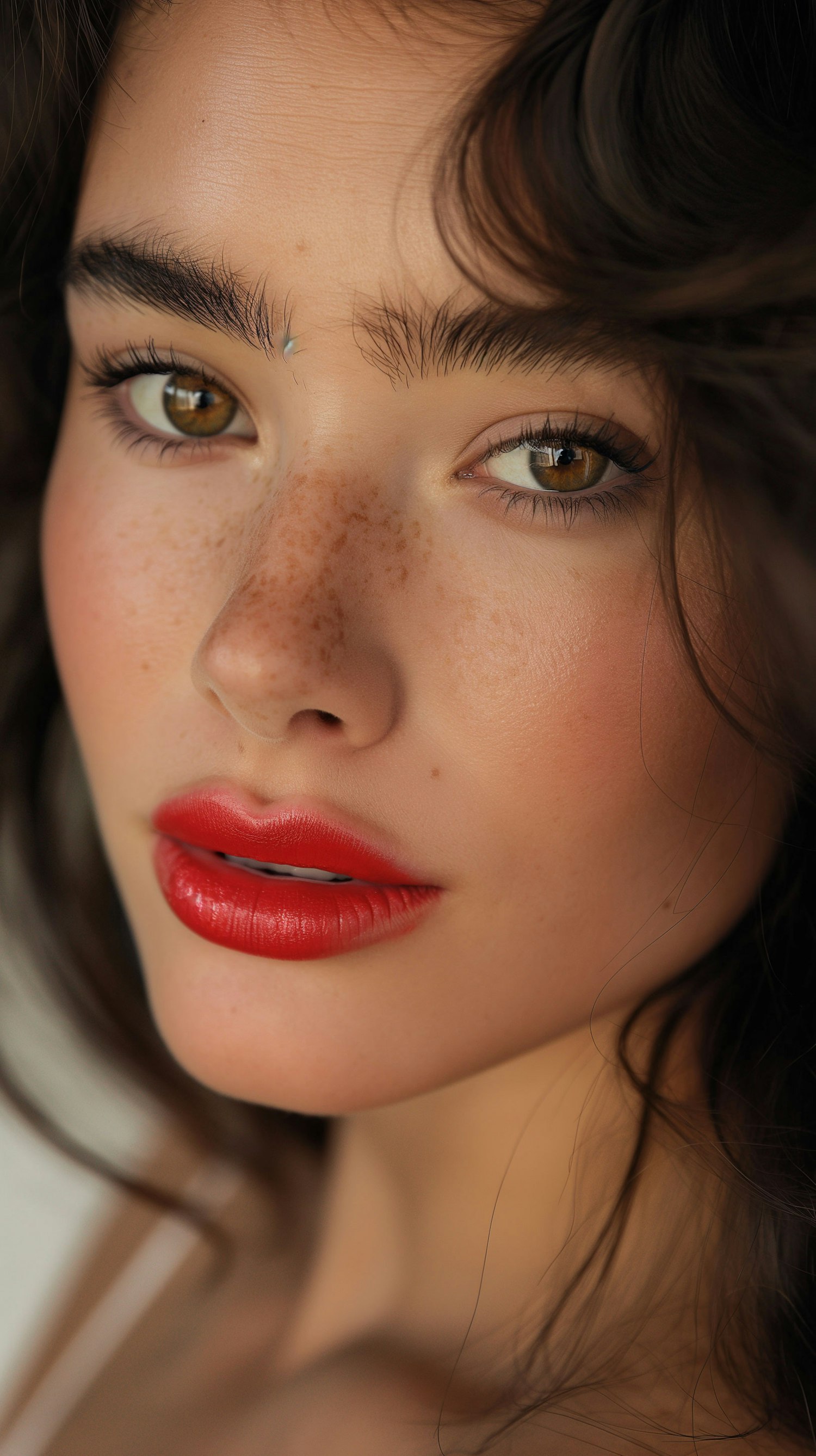 Close-up portrait of a young woman with freckles, red lips, and expressive brown eyes, highlighting natural beauty and texture.