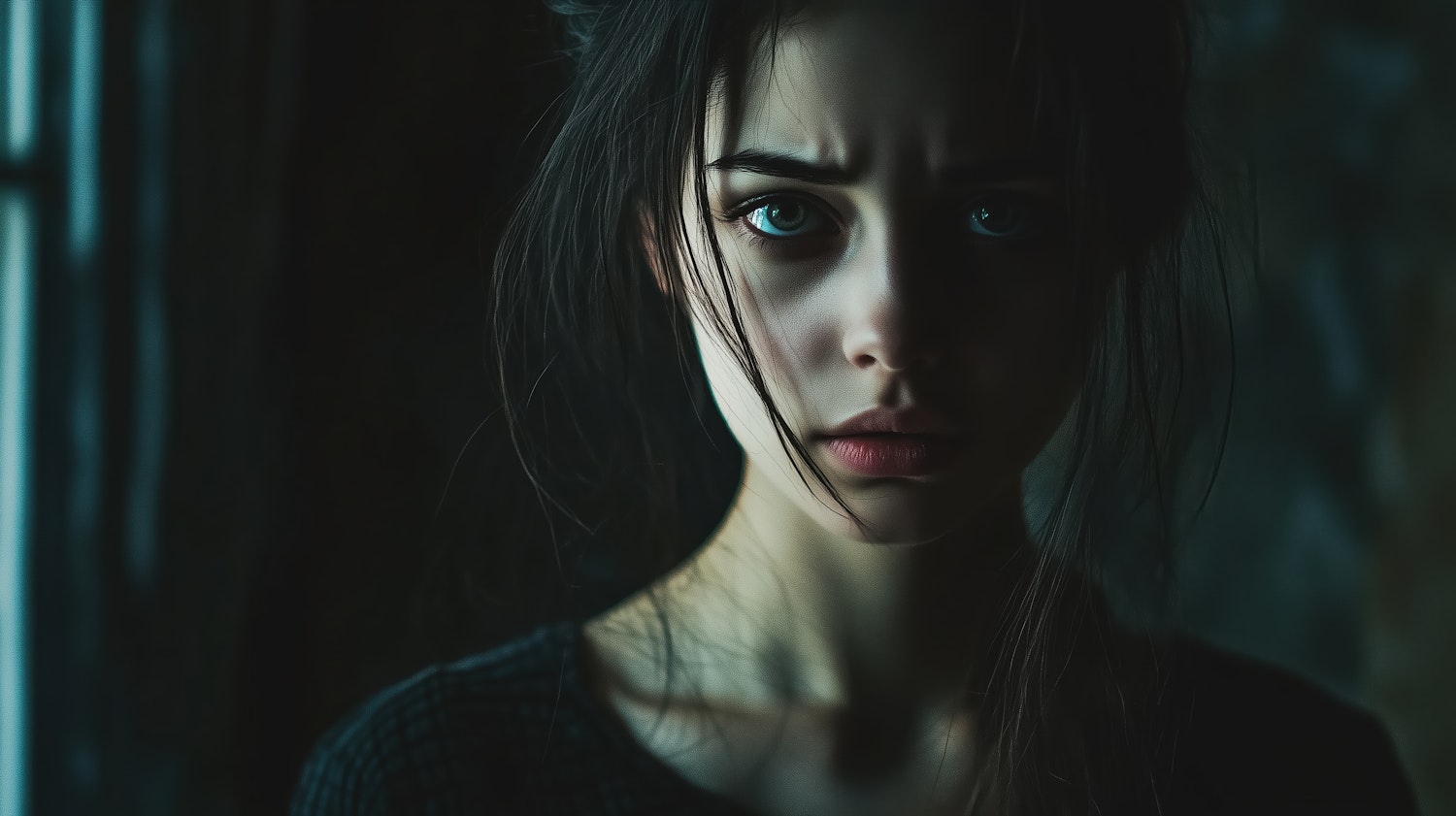 Moody portrait of a young woman with intense blue eyes and dark hair, captured in soft, dramatic lighting.