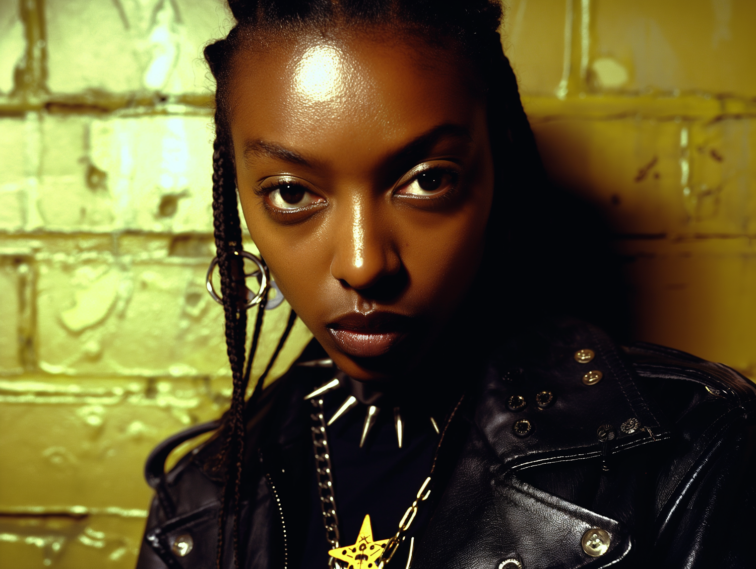 Intense portrait of a young woman in a leather jacket against a yellow brick wall, exuding a bold and edgy style.