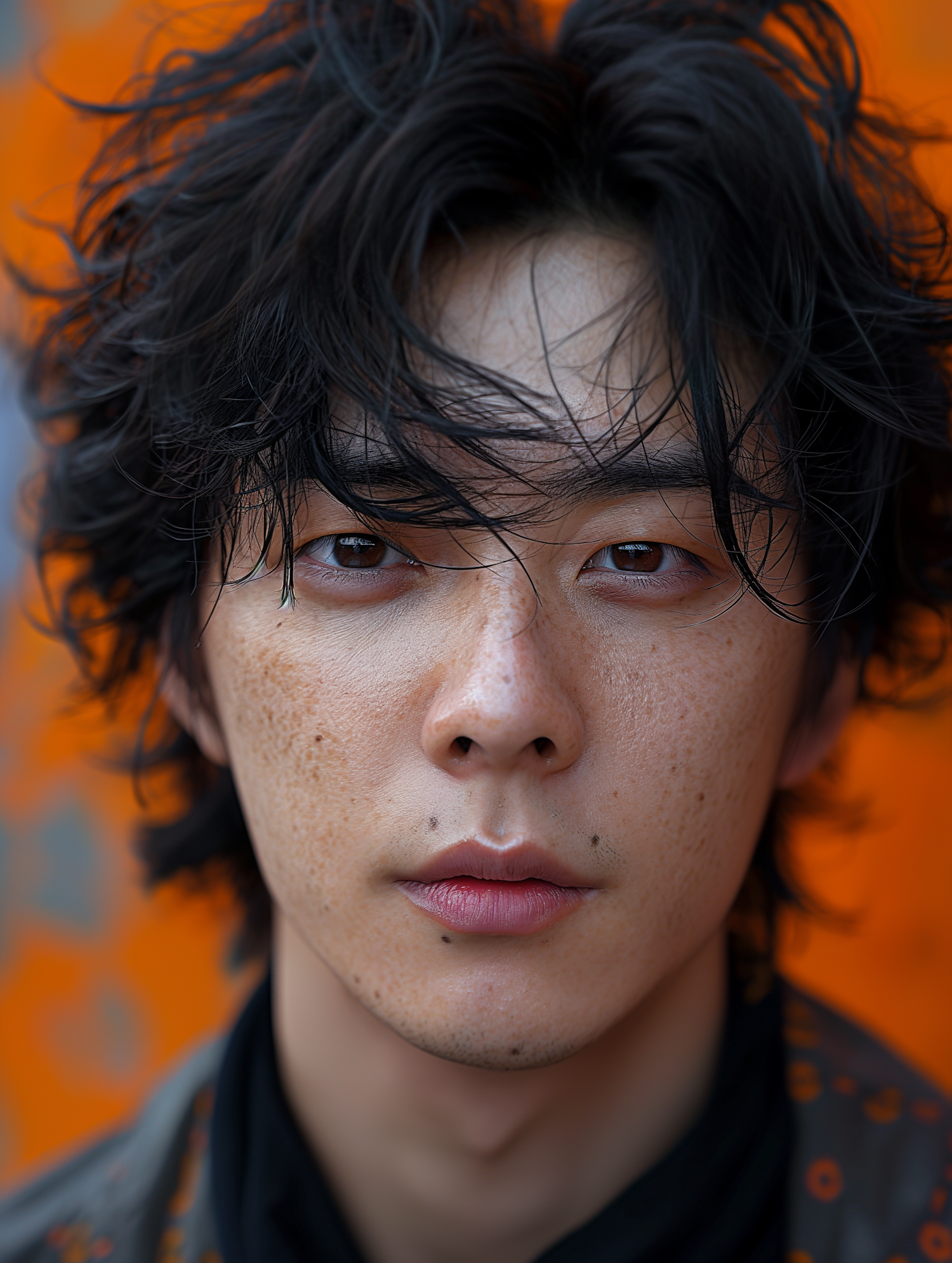 Close-up portrait of an Asian man with wavy hair and freckles, set against a vibrant orange background.
